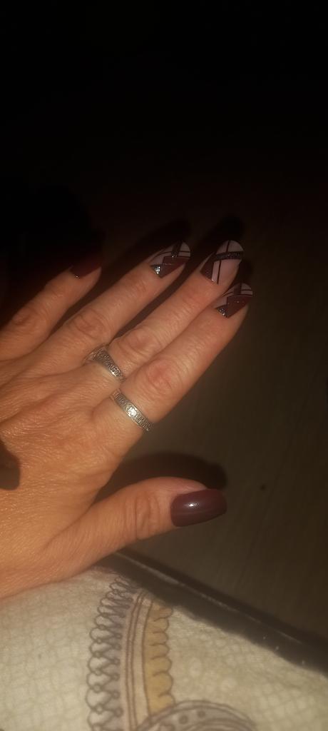 In fact, it looks worse. The color is not black, but cherry, the stripes are not very neat (for the sake of a clear and beautiful pattern, such nails are generally chosen! )