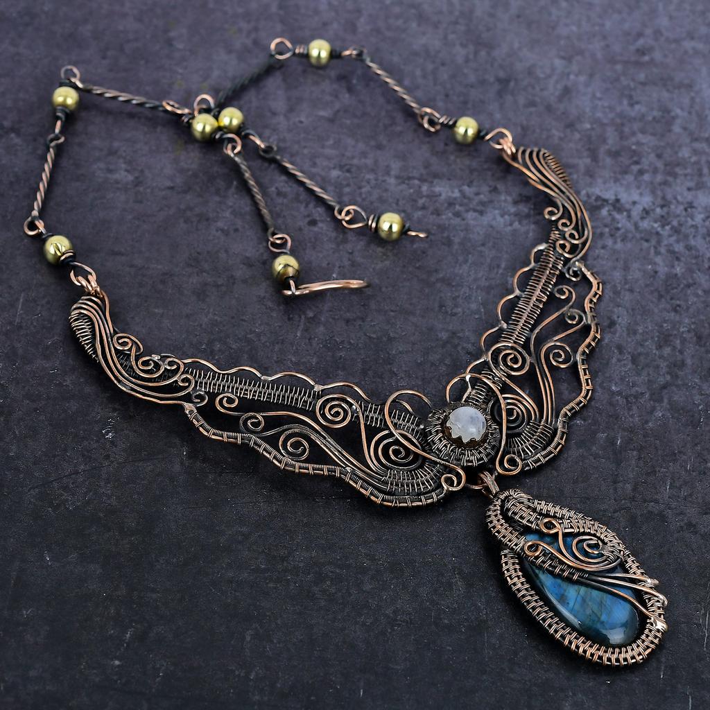 Labradorite, Moonstone Gemstone Copper Wire Wrap Jewelry Necklace 18" P0S07