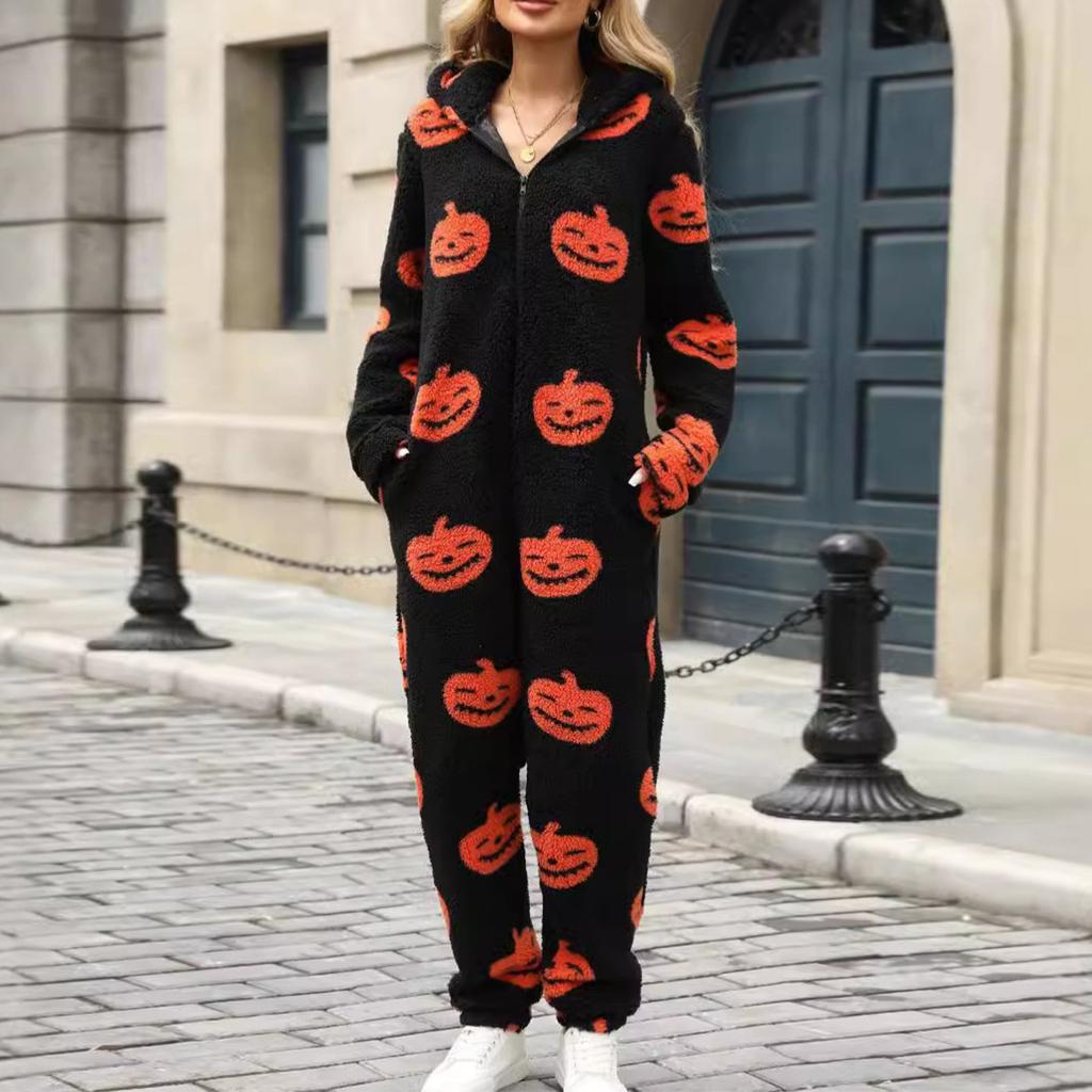 Women's Halloween Print Zipper Loose Plush Jumpsuit