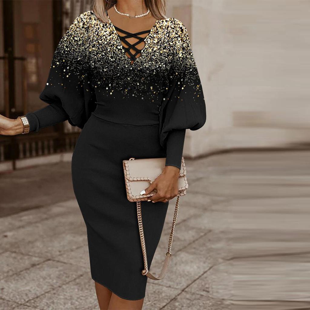 Women's Fashion V-Neck Hollow Long Sleeve Sleeve Printed Dress