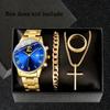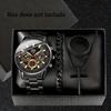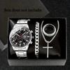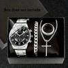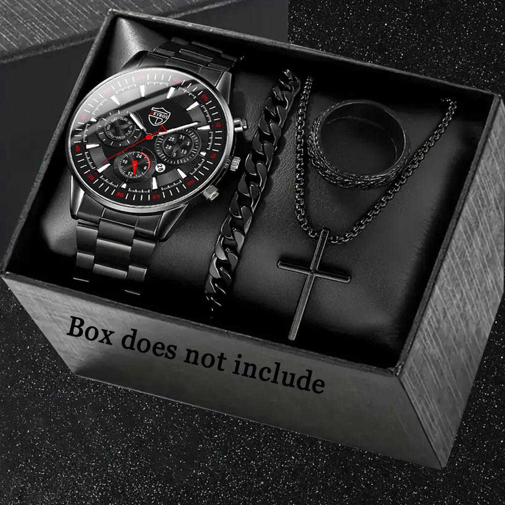 Men's 4-Piece Fashion Watch Set with Quartz Movement: Alloy Case, Stainless Steel Strap, Date Feature, Includes Watch, Bracelet, Cross Necklace, Ring