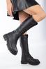 Women Modern Stylish Fashion Boots Faux Leather Black Zippered Knee Length Heeled Boots