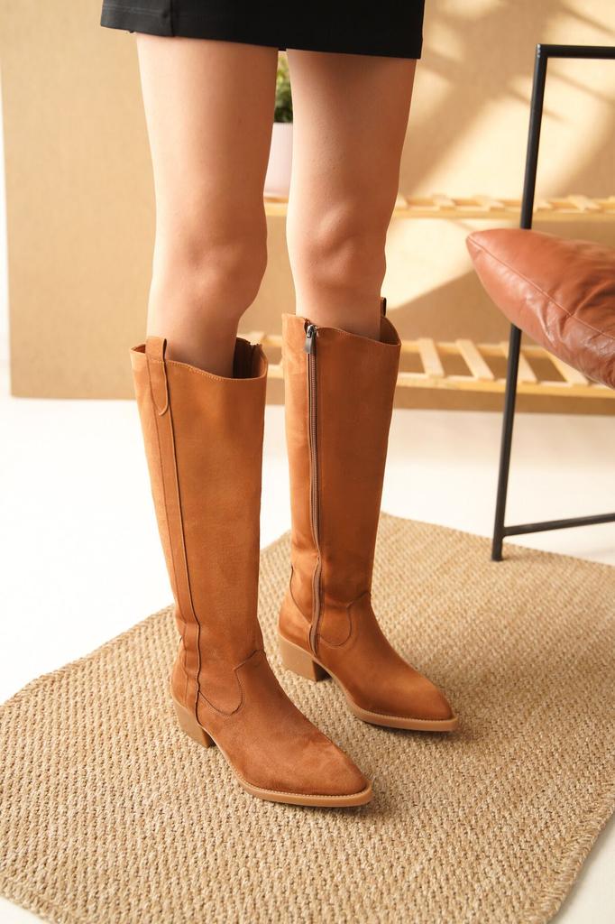 Women Modern Stylish Fashion Boots Faux Leather Suede Pointed Toe Zippered Knee High Tan Suede Boots