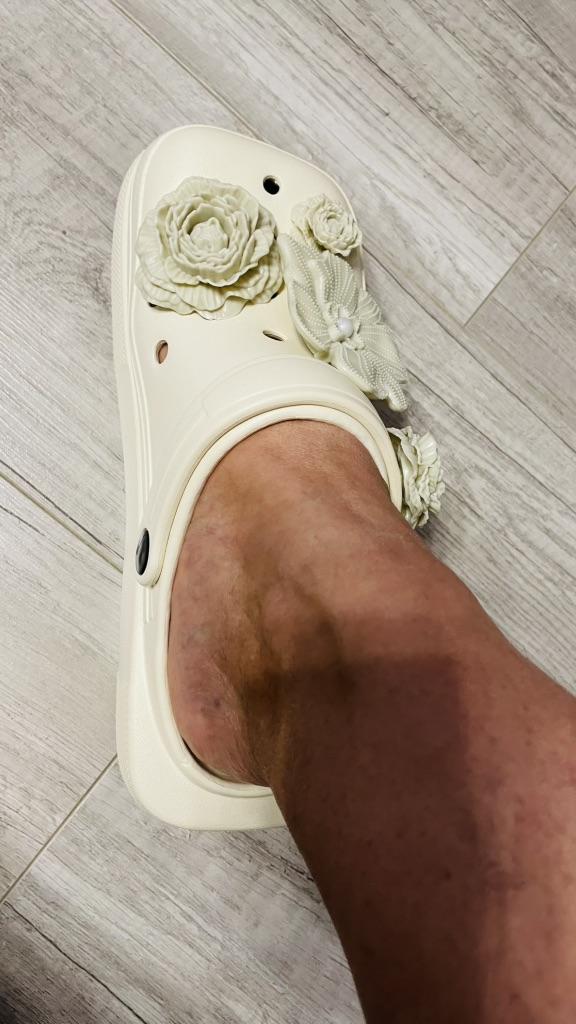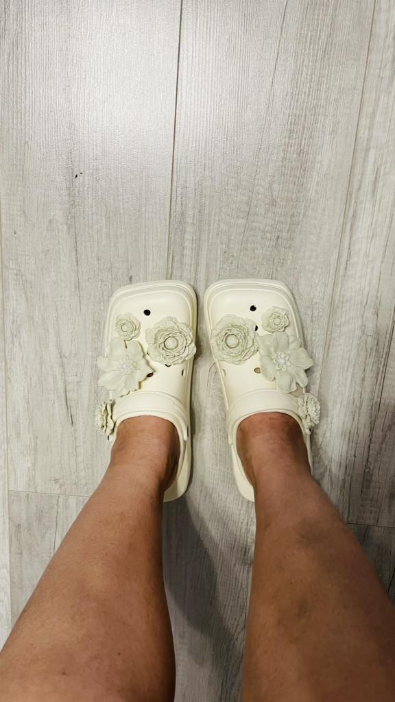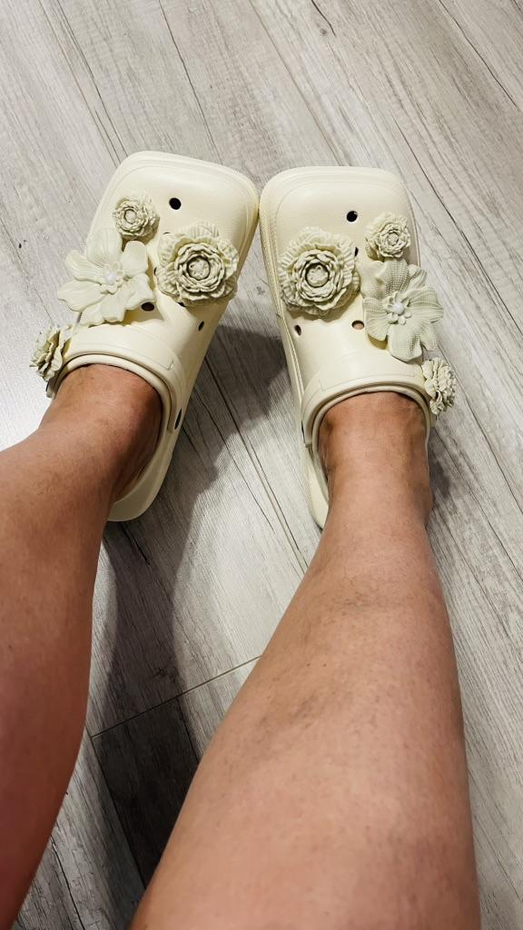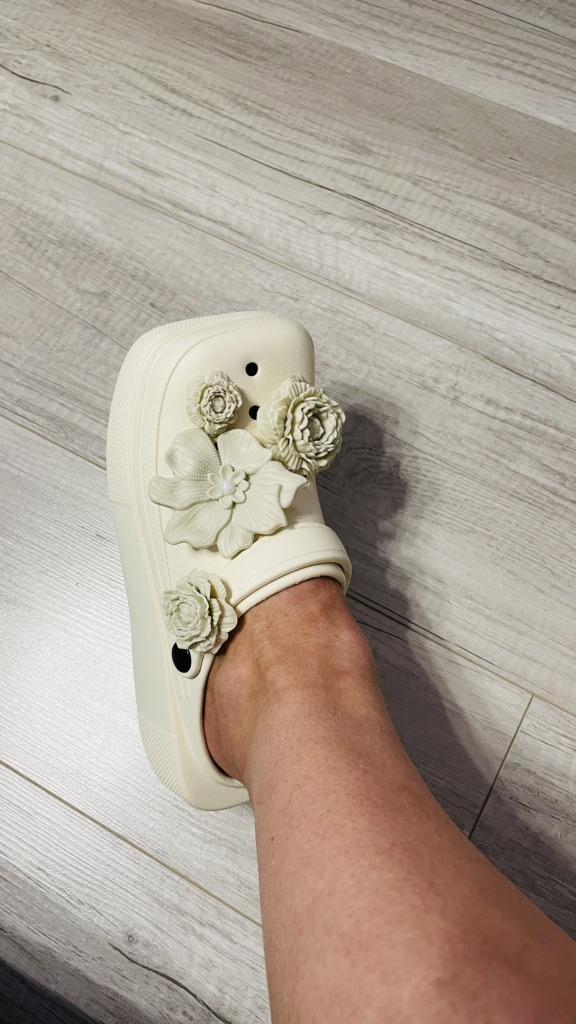 Very light, in principle good. There was a black inscription on the strap, I removed it with nail polish remover. The jibbitz are mine and were not included in the set. I wear size 38, they fit. In width, they are a very tight fit. My foot width is medium.