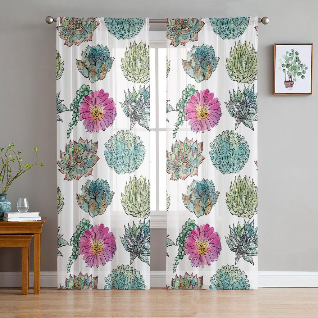 Plant Watercolor Succulent Window Treatment Tulle Modern Sheer Curtains for Kitchen Living Room the Bedroom Curtains Decoration