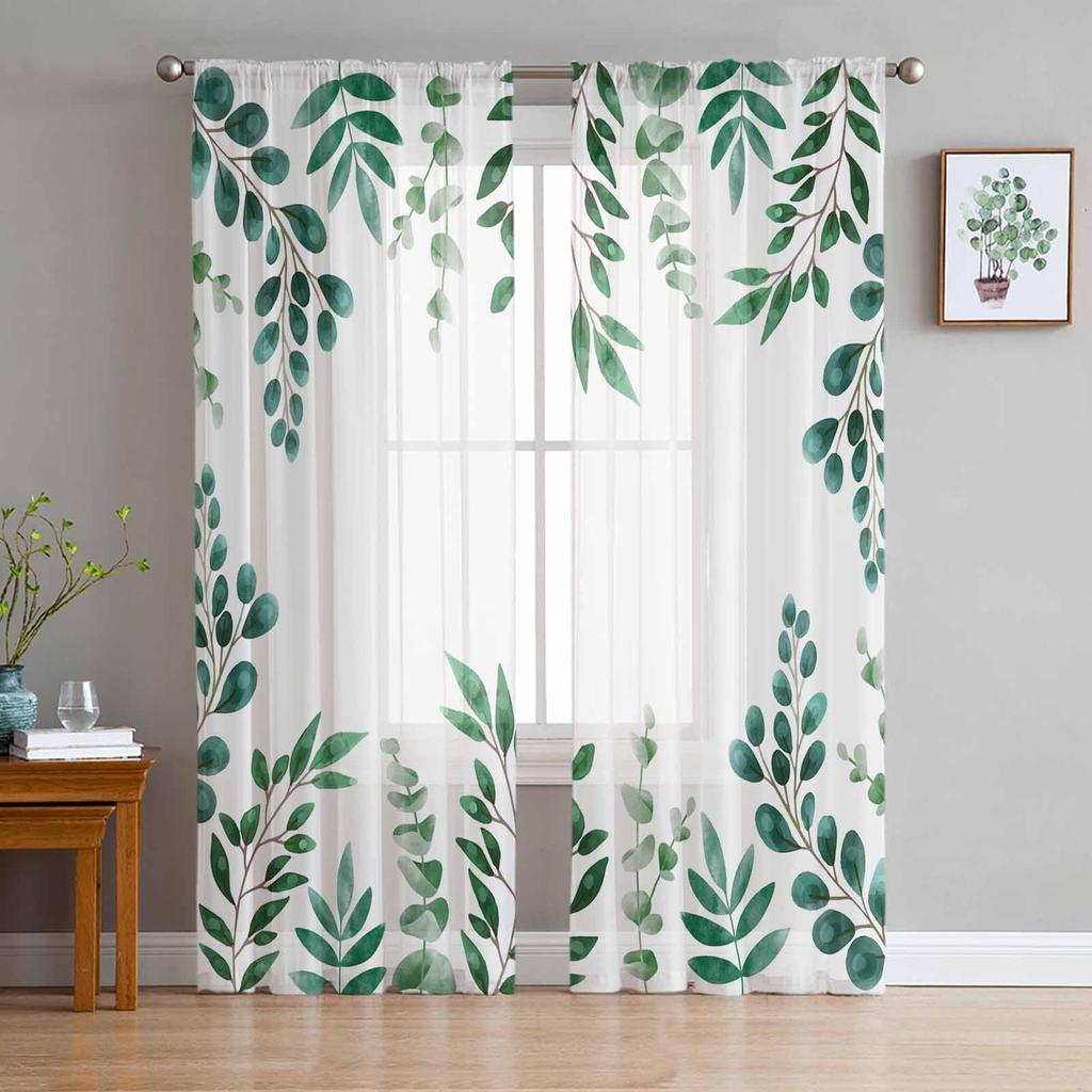 Plant Dark Green Tea Green Leaves Watercolor Rural Sheer Curtains for Kids Living Room Voile Window Curtains Tulle Drapes