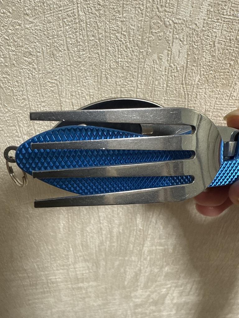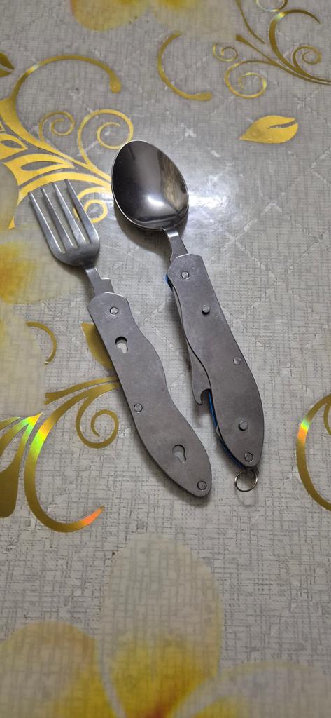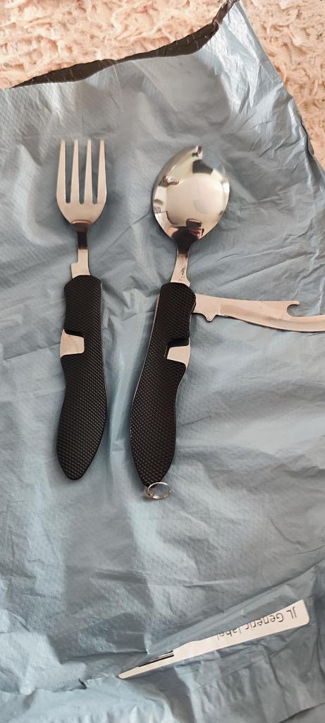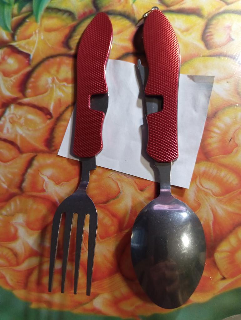 Interesting hiking tool, made with quality, separates into two: a spoon with a knife and a bottle opener, and a fork separately.