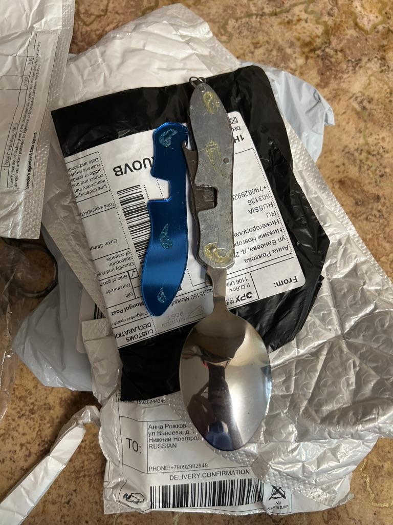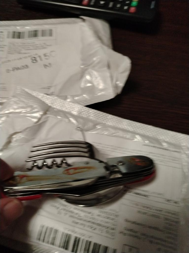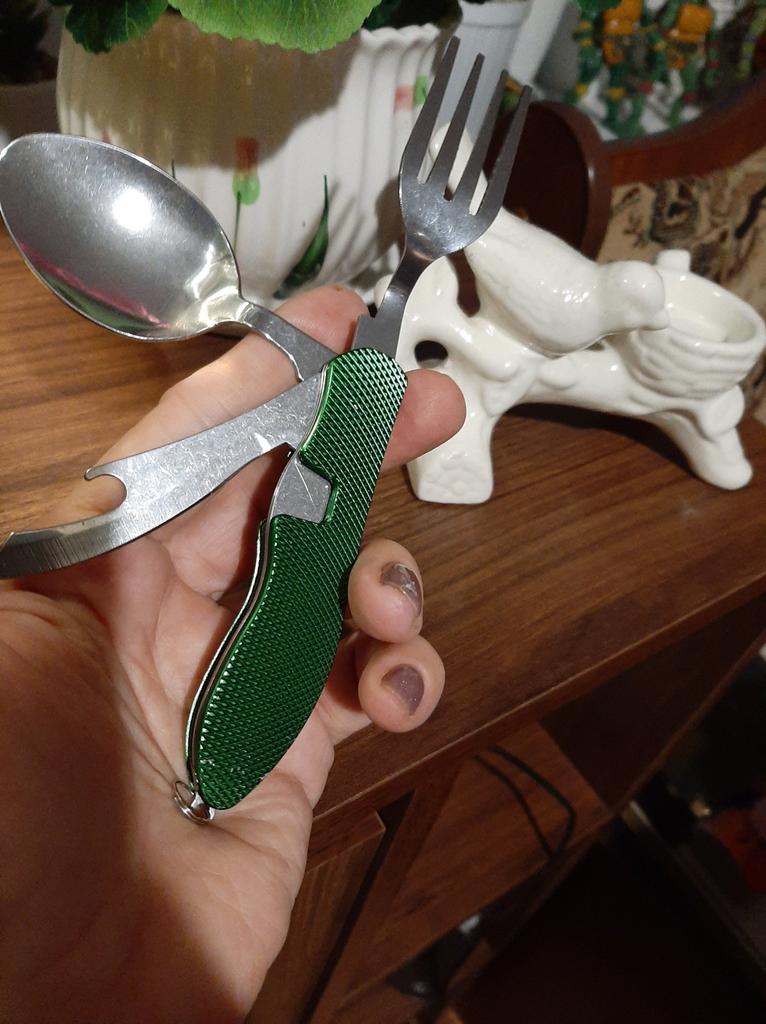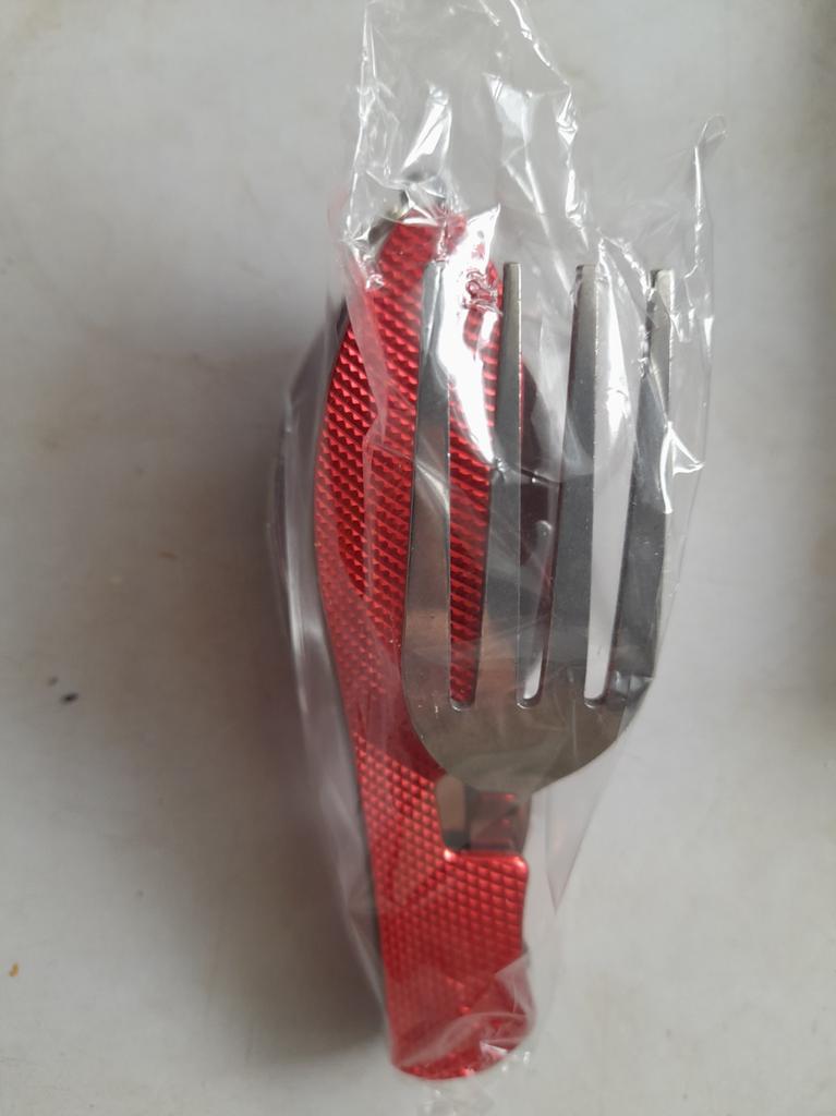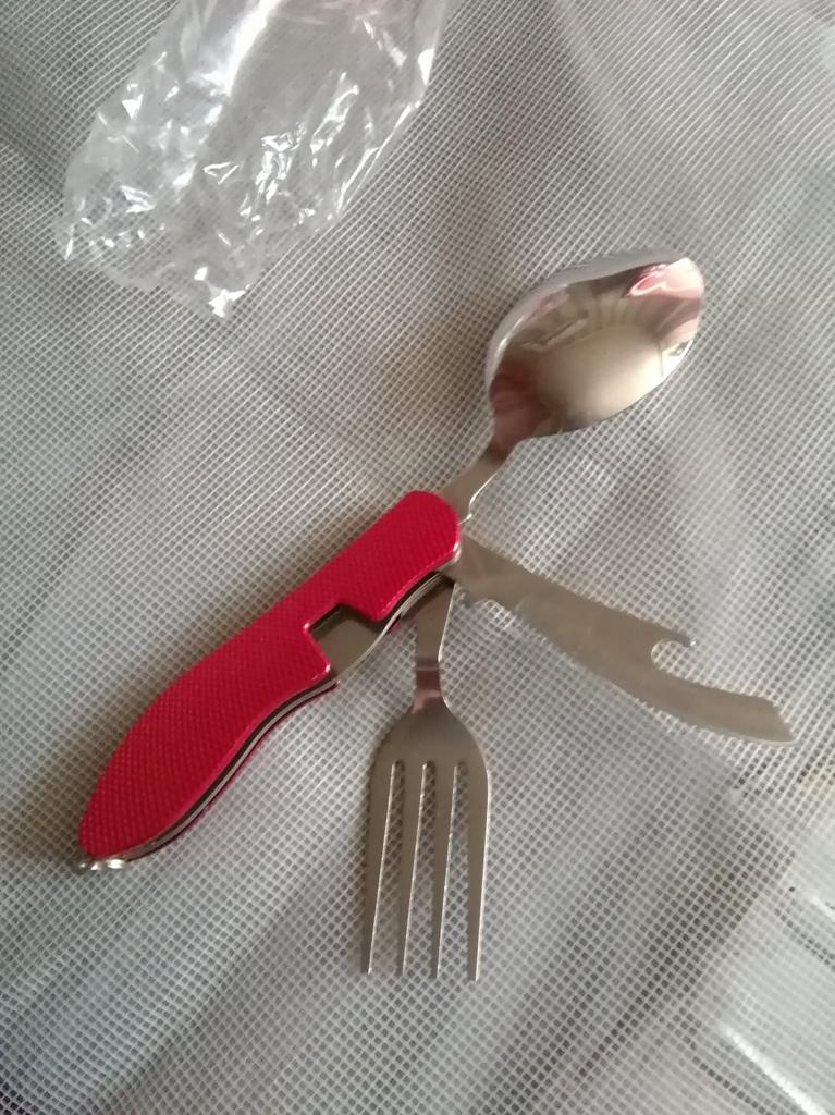 Matches the photo, functional: both a knife, and a fork, and a spoon, and an opener - 4 in one.