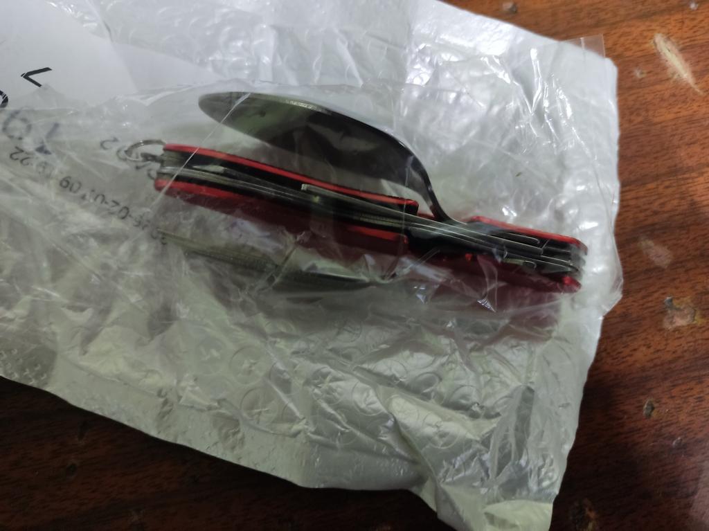 Very good set, there is a spoon, fork, knife, very sharp, and an opener. Thank you