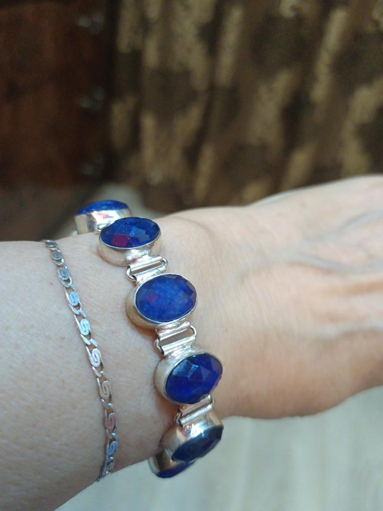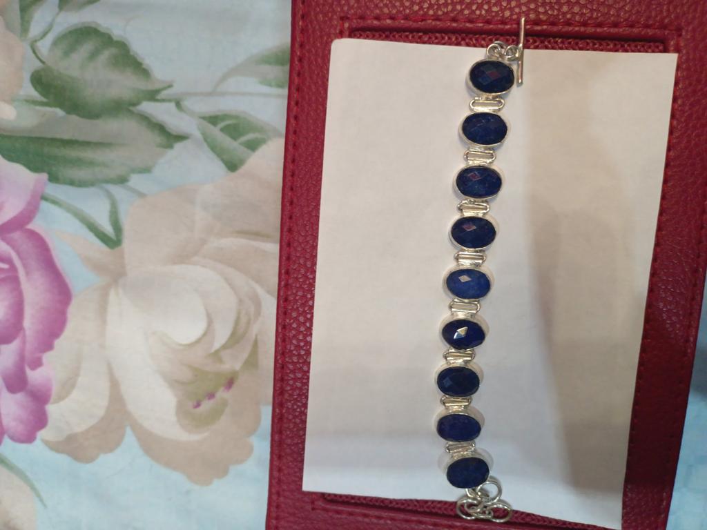 Bracelet of Indian craftsmen with a real semi-precious sapphire of deep blue color. Quite clean and high-quality processing of the product. Simple lock, but holds the bracelet on the hand well. Stones in the amount of 9 with beautiful cutting. The purchase exceeded all my expectations.