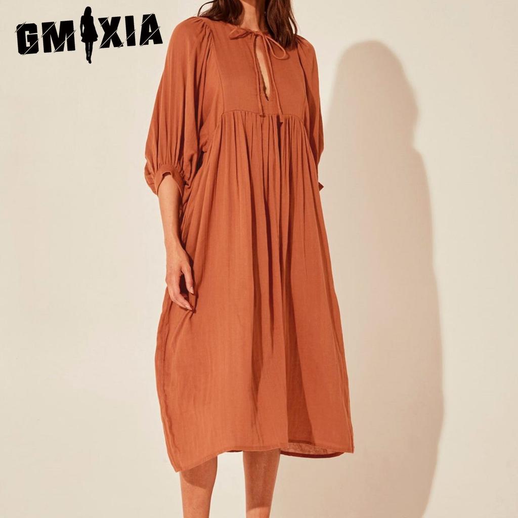GMXIA Women's Fashion Spring Autumn Solid Color Print Long Sleeve V-Neck Casual Dresses