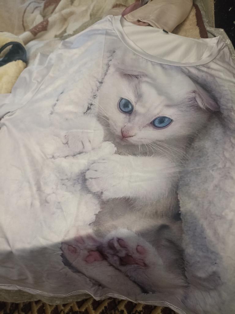 Very disappointed, it's written almost like a sweatshirt or sweater, but in reality, it's a thin synthetic t-shirt, absolutely nothing like the model, not a sweater at all. I do not recommend buying it. Didn't see anything funny, the print is complete crap... Another lie to the customer.