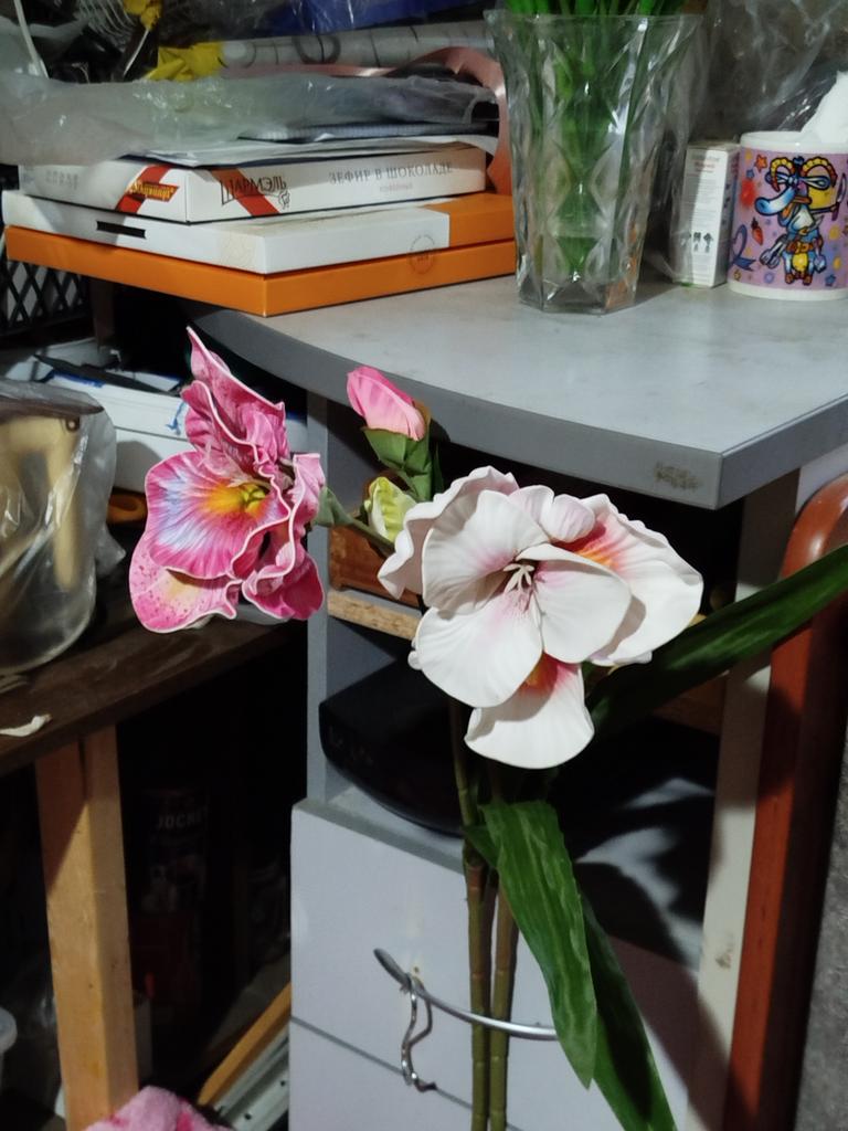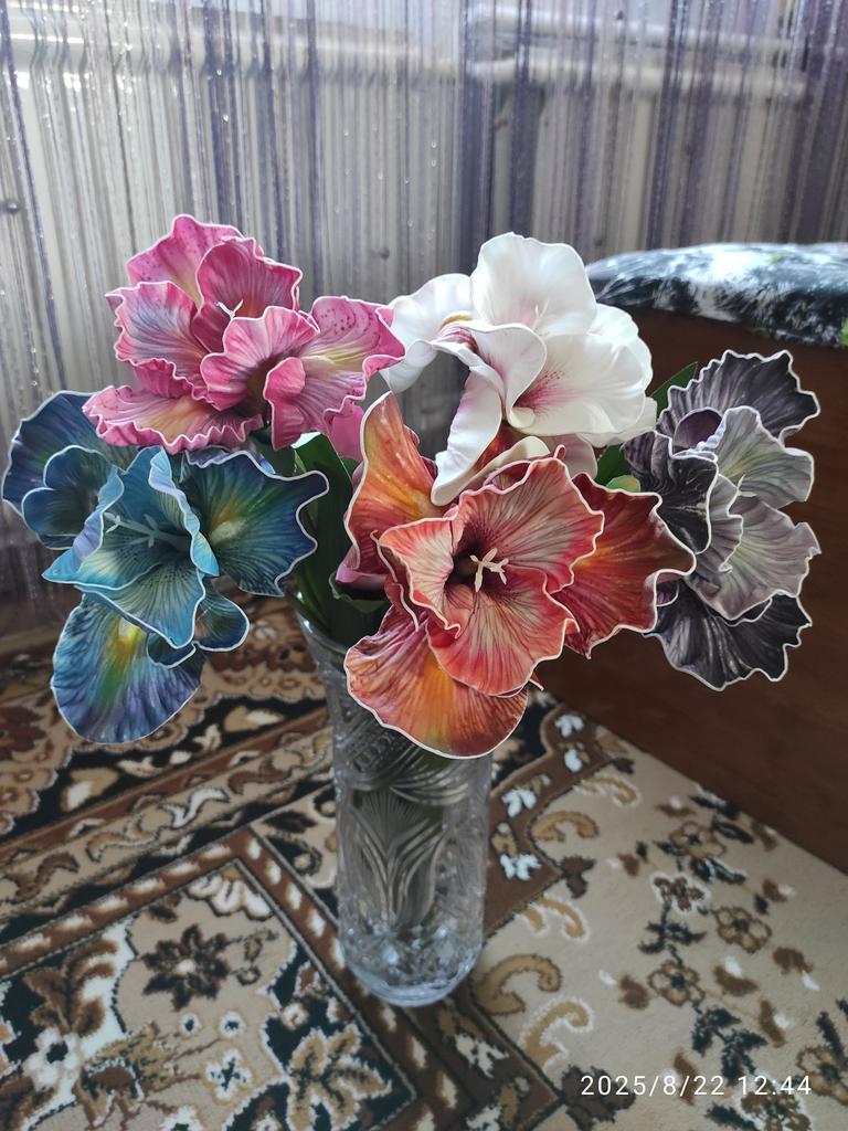 Expected more. Took 5 different ones. The material is strange - not fabric, but not silicone either, as if something foamed. There is a slight smell. In the photo, the flowers look good, even beautiful, but, believe me, in reality they are not as impressive and colorful, the photo exaggerates. I'm disappointed, you could say. Yes, and the stems are VERY long and thick, had to shorten them a lot. Removed the leaves, they are kind of silly.