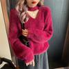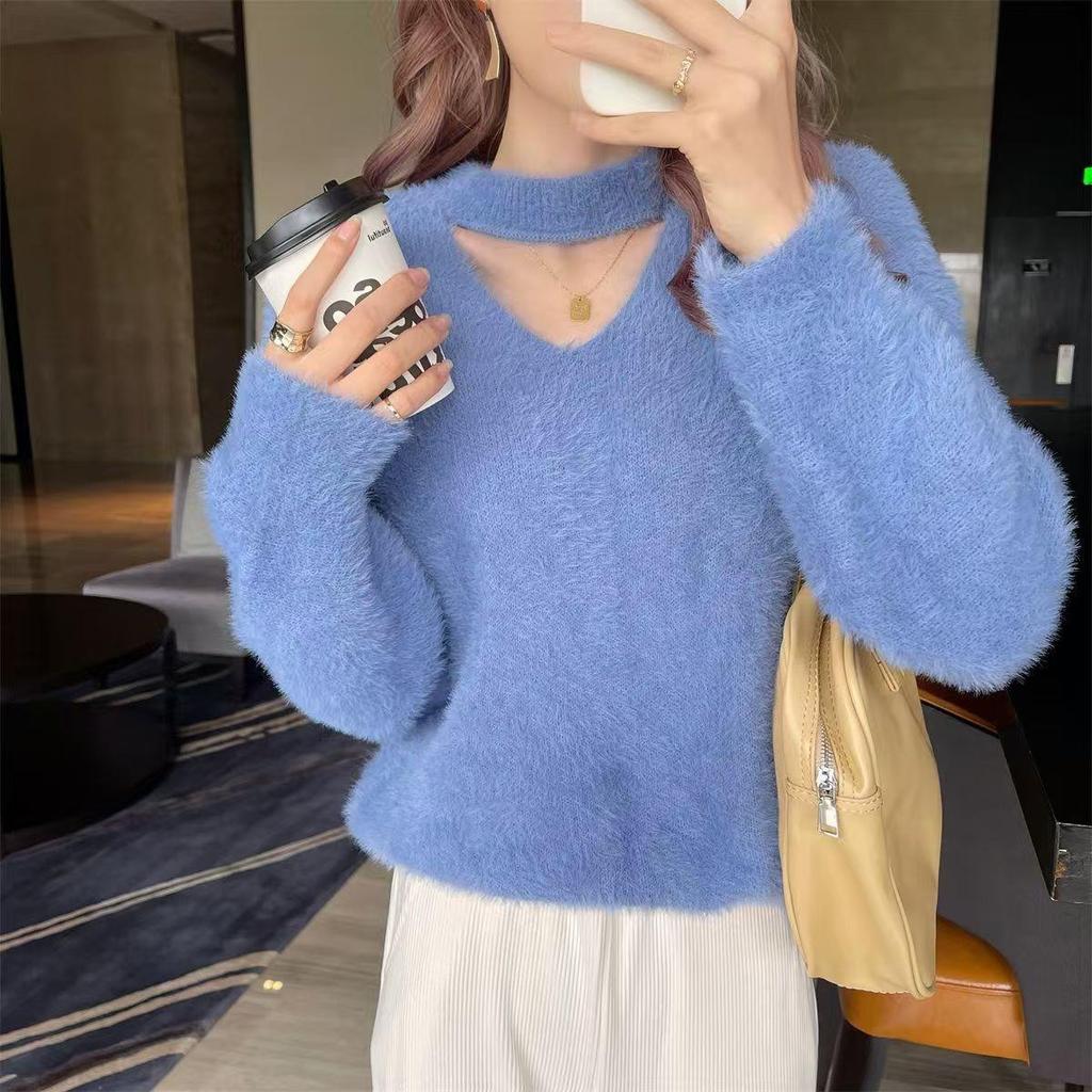 New Autumn and Winter V-neck Halterneck Sweater for Women Imitation Mink Velvet Lazy Style Loose Outer Knitted Sweater Top for Women
