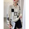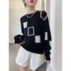Color Blocked Checkered Knitted Sweater Top for Women In Spring and Autumn Thin Style Retro Round Neck Mohair Sweater