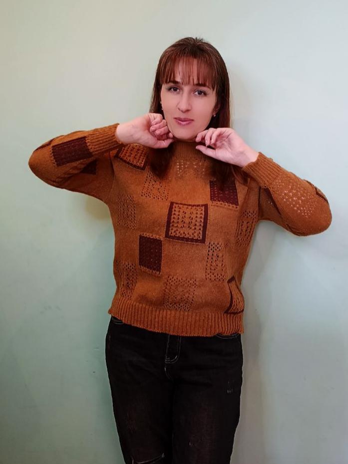 The sweater is cute, looks good, short. For size 48 it fit just right-- tight. With a decent bust, you need to order a size larger!
