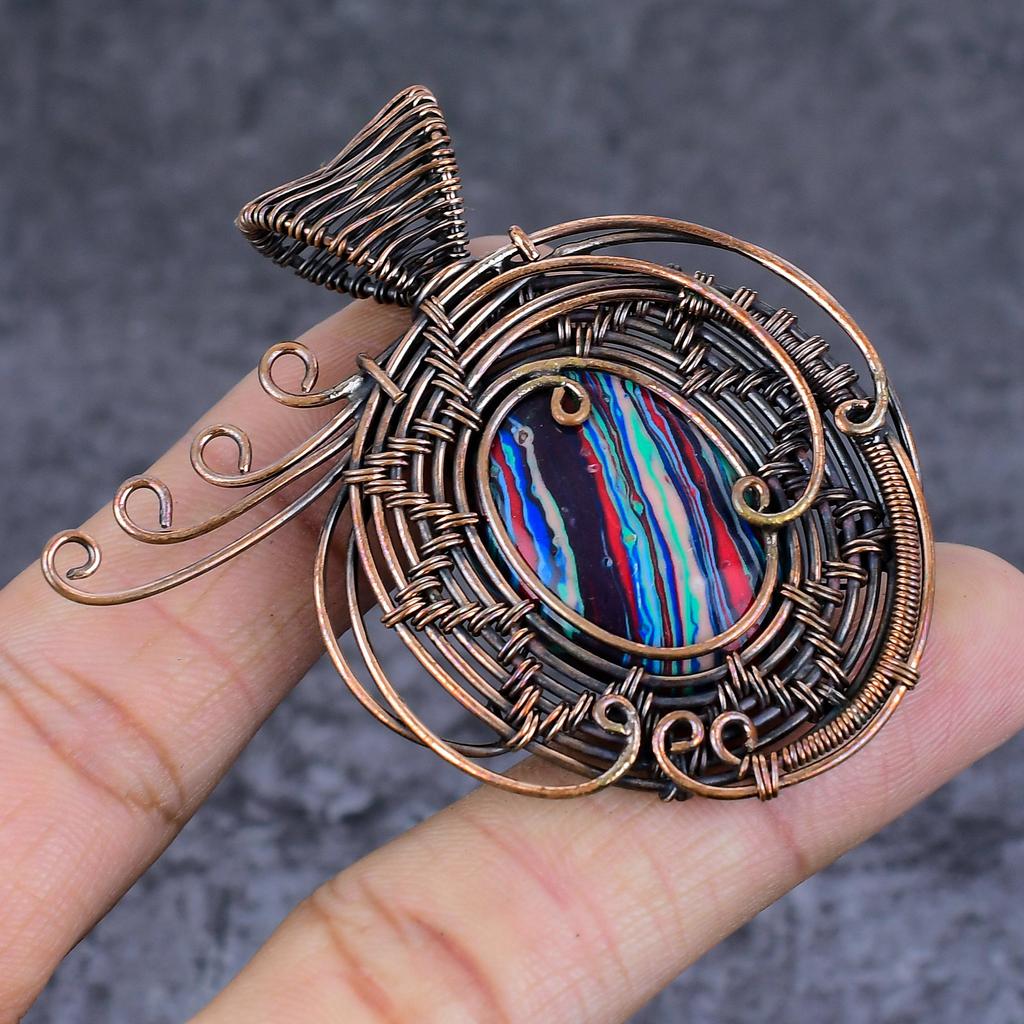 Natural Rainbow Calsilica Gemstone Copper Wire Wrap Jewelry Pendant 2.36" U8v18