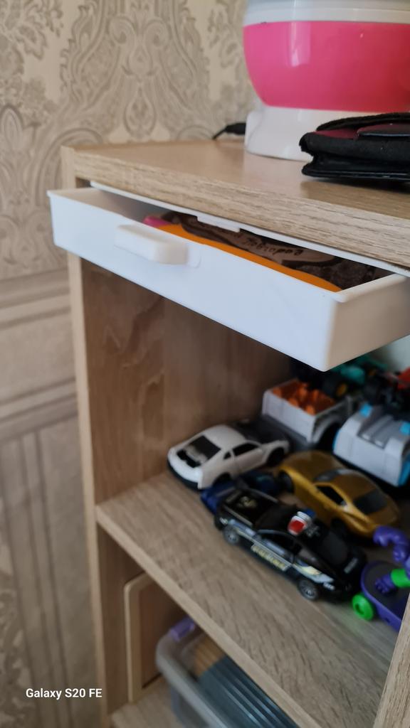 The box is poorly and incorrectly constructed: the walls are thin, and the stiffening elements are glued in the wrong places and in the wrong direction. There are details designed to stop the drawer exactly under the lid - their construction is so incorrect that the box easily flies out from under the countertop both forward and backward, scattering all the small items stored in it. I cut off all the details and made the construction simpler and working.