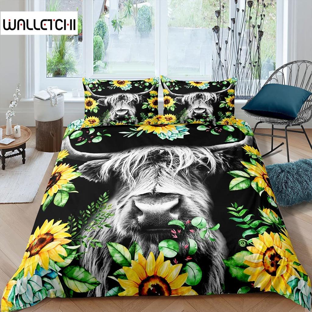 Highland Cow Duvet Cover King Sunflower Black Cattle Bedding Set Microfiber Farm Animal Cow Western Farmhouse Cattle Quilt Cover