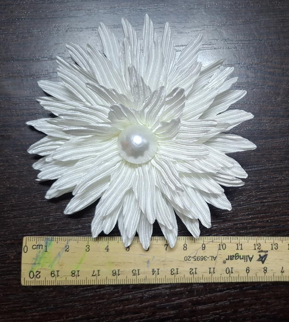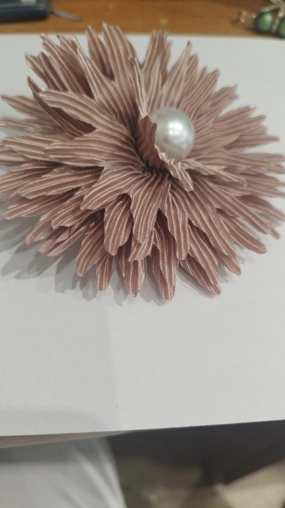 I didn't even expect this decoration to look so beautiful. The gray color of the corrugated fabric with a silver tint, from which this chrysanthemum is made, creates the impression of a "haute couture" decoration. I am very pleased..