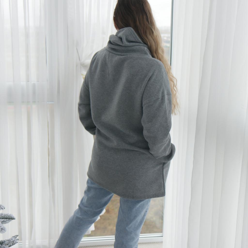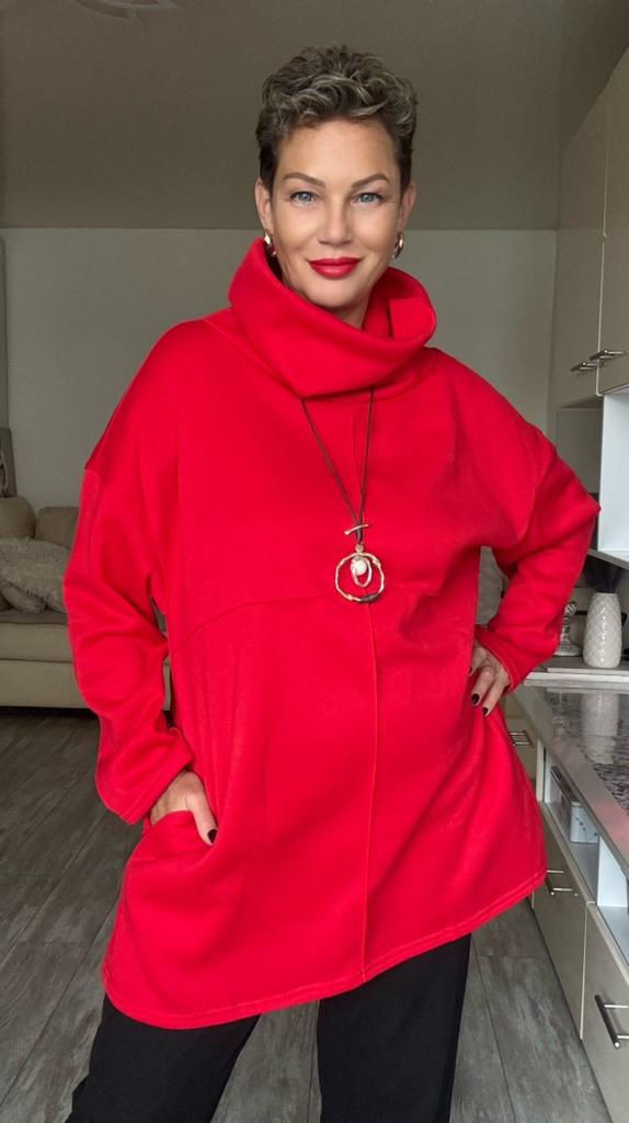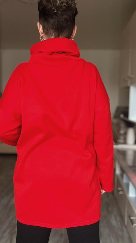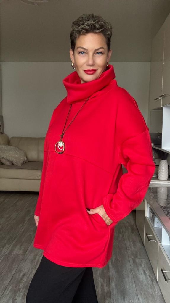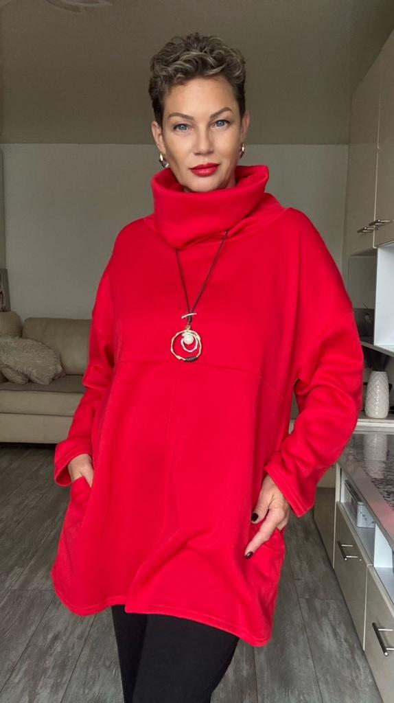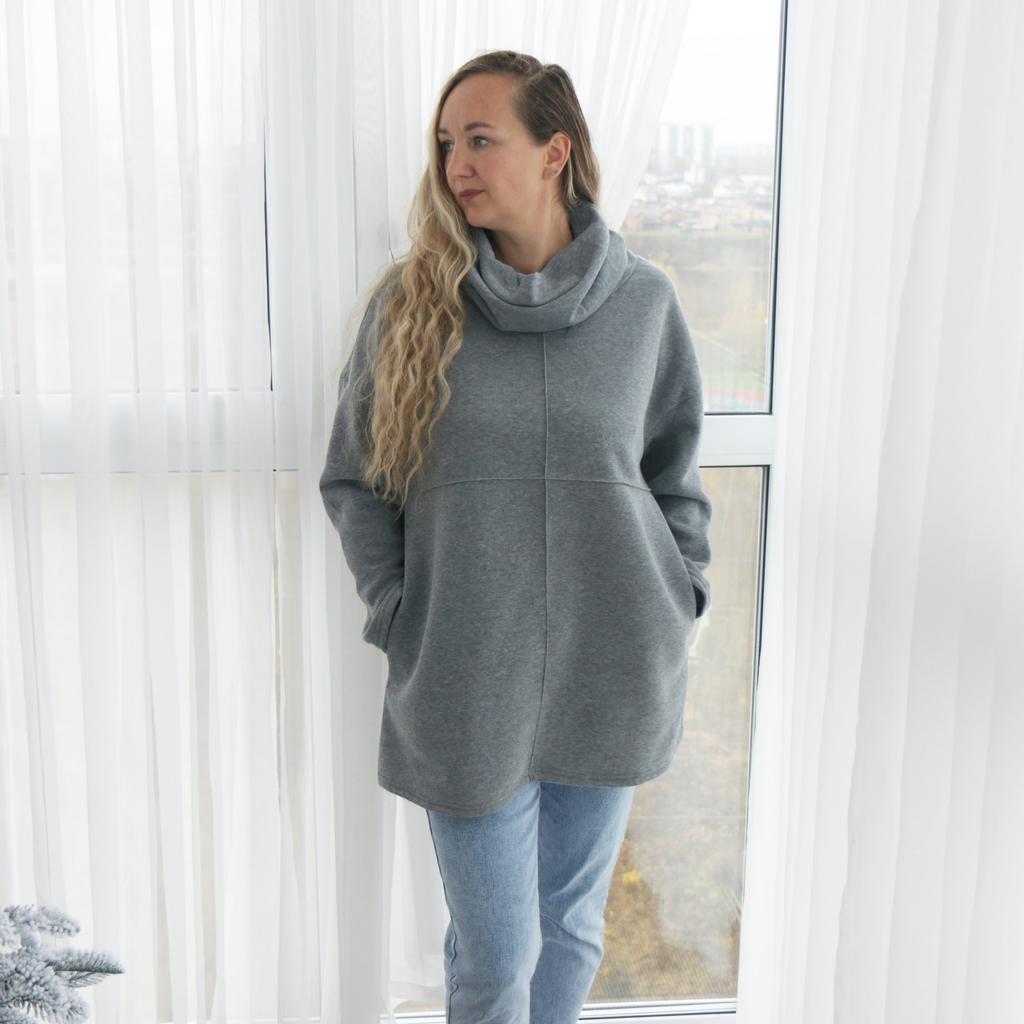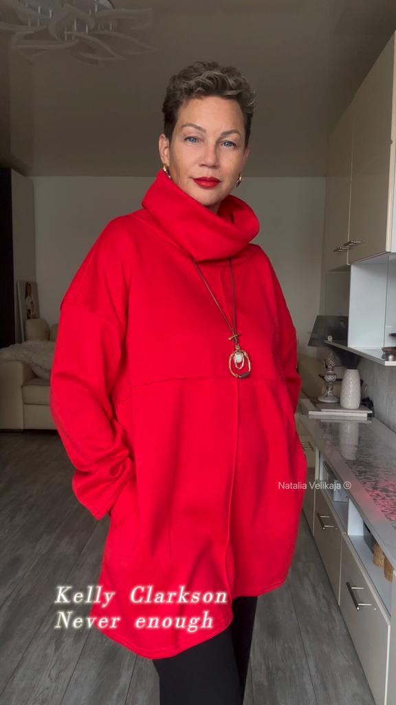 Very cozy and warm oversized jumper with big turtle neck,the only thing is it's quite static fabric.Fabric is polyester,,ordered size L on chest 100cm and it fits perfectly. Delivery took 3 weeks to Ireland.Happy Shopping!