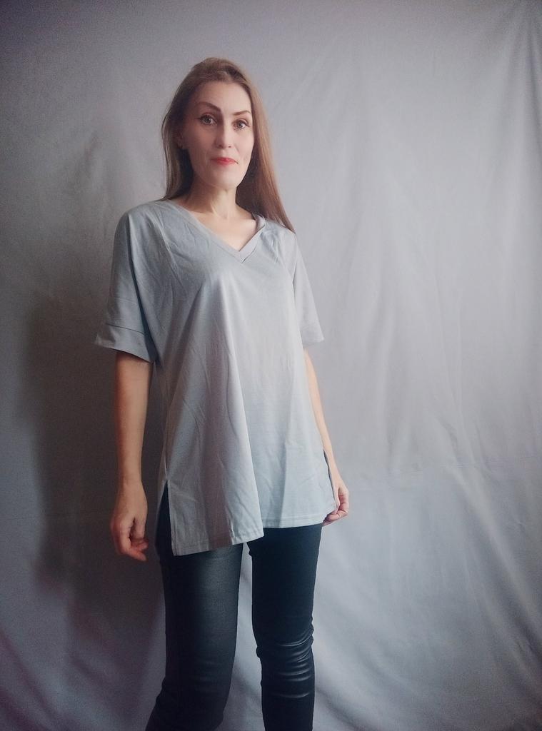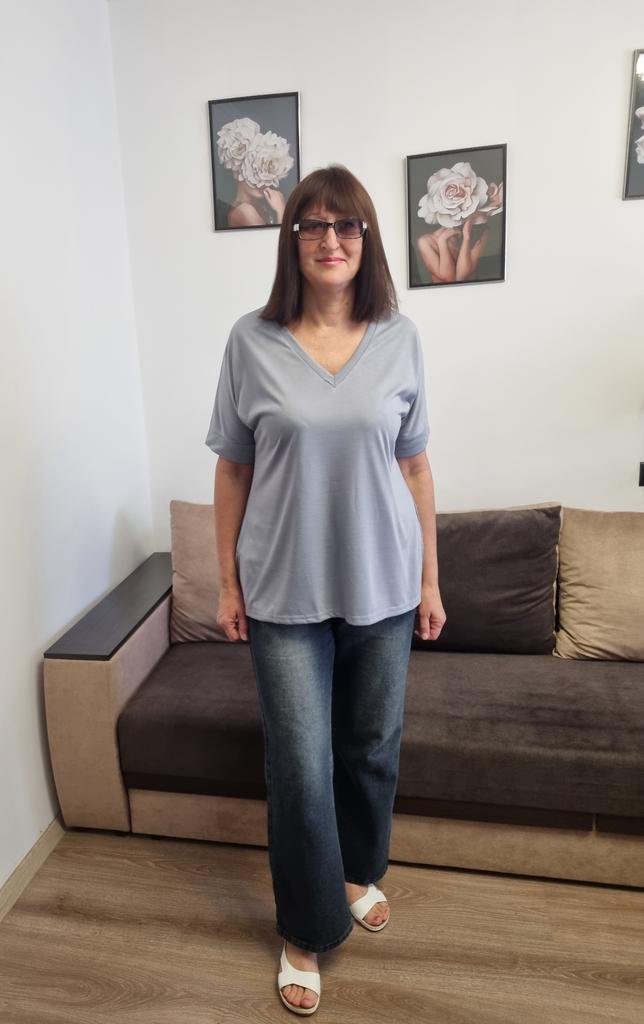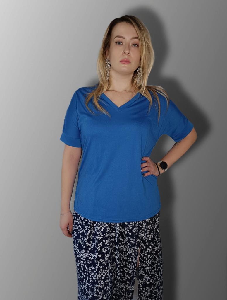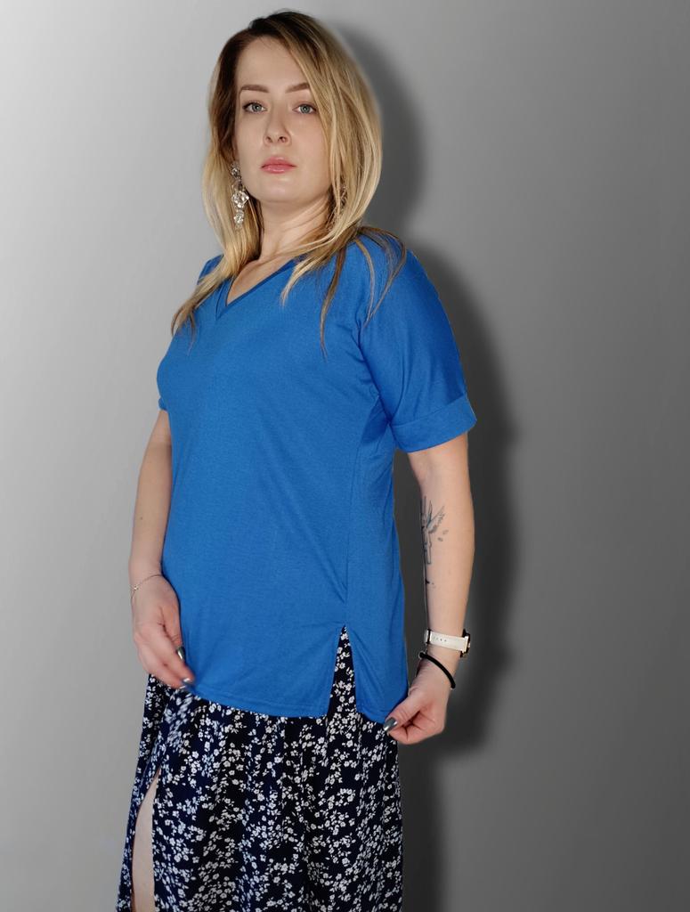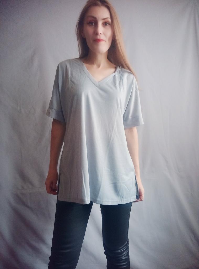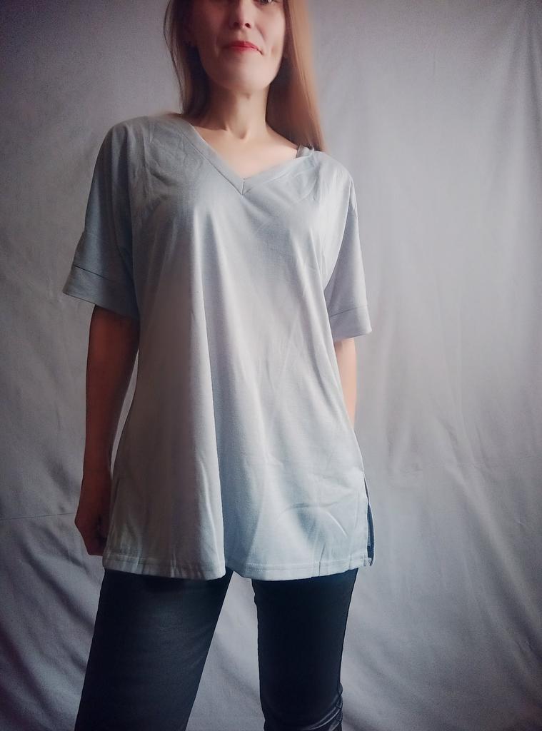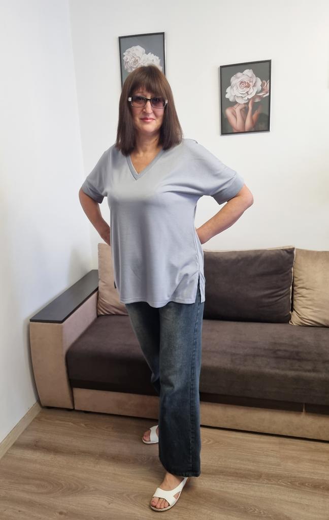 This shirt is a great choice for plus-size women looking for a basic, comfortable, and flattering item for summer. The loose fit combined with a V-neck creates a body-flattering look, with a sense of airiness and comfort.. The uniform and clean colors allow for easy integration with any item of clothing – jeans, a skirt, or shorts. The fabric, made of cotton and spandex, ensures a soft feel on the skin with a slight stretch that adapts to the body's natural movement.. The stereoscopic elements add a subtle design interest, without being too dominant. This shirt is suitable for everyday wear, for work, or for a light summer outing – a classic item that is always worth having in the closet.