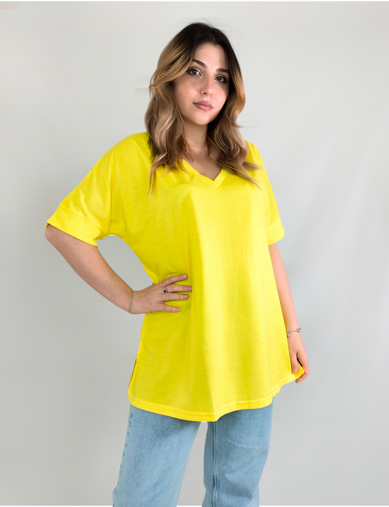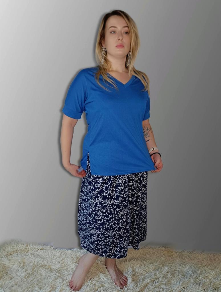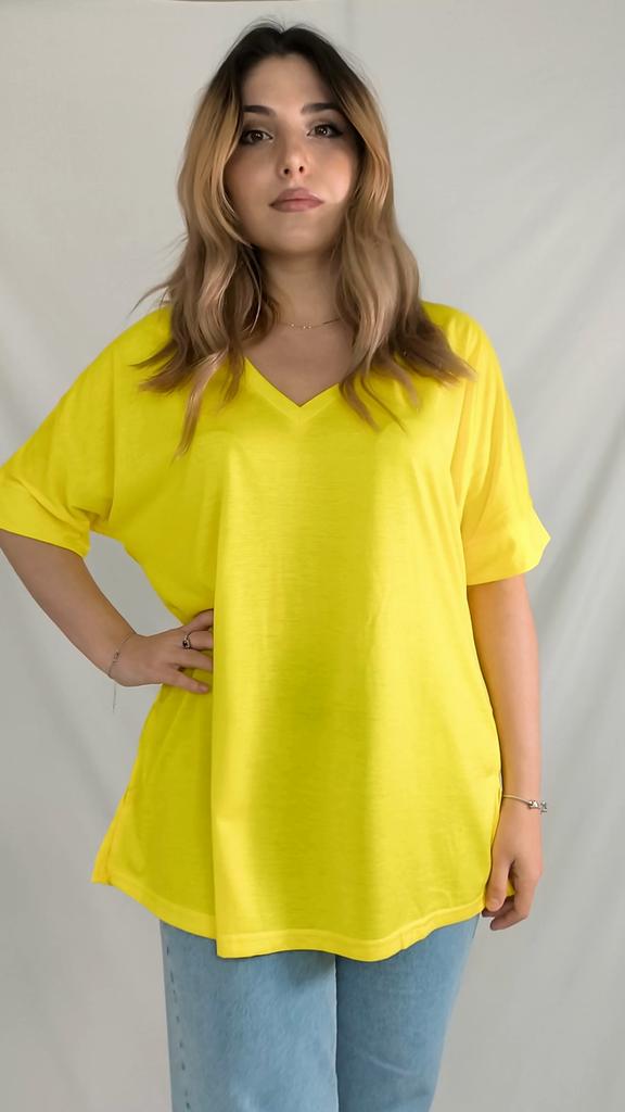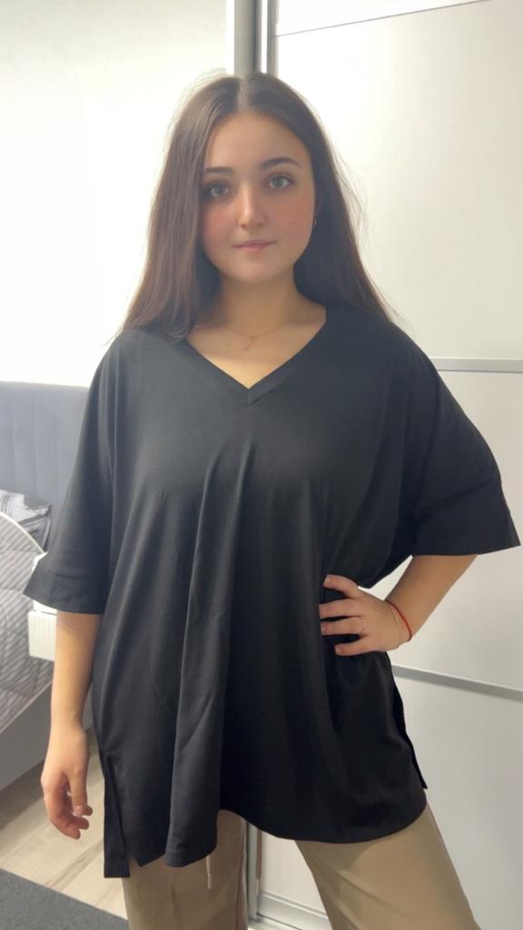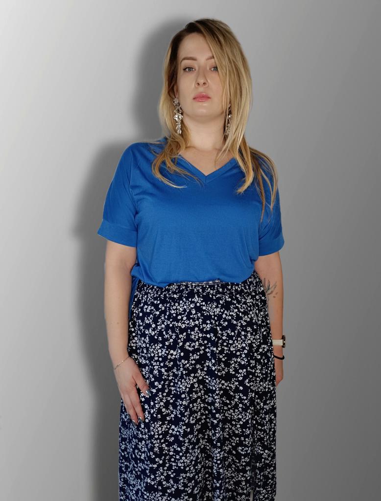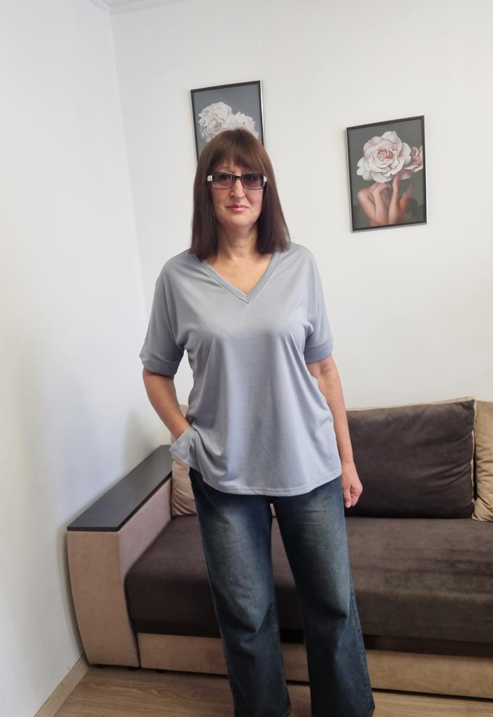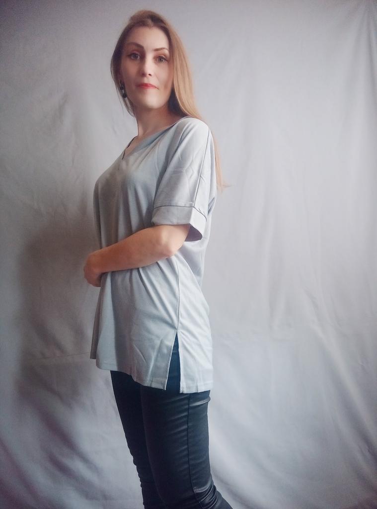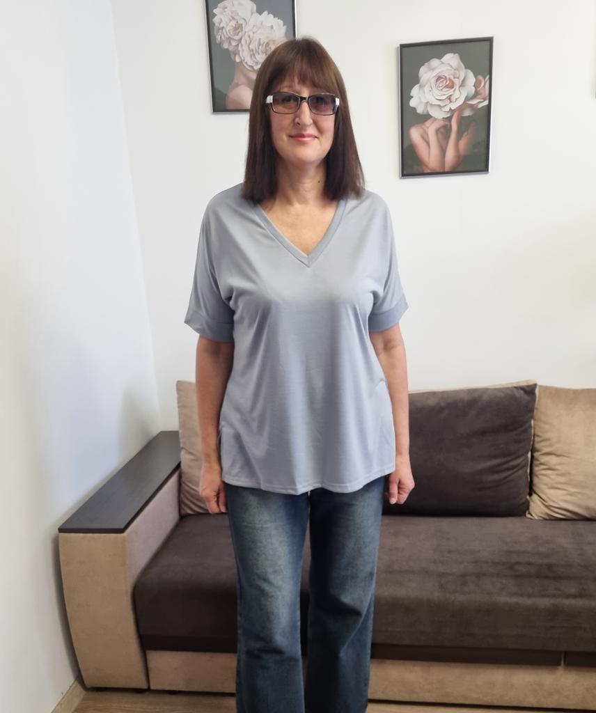 This shirt is a great choice for plus-size women looking for a basic, comfortable, and flattering item for summer. The loose fit combined with a V-neck creates a body-flattering look, with a sense of airiness and comfort.. The uniform and clean colors allow for easy integration with any item of clothing – jeans, a skirt, or shorts. The fabric, made of cotton and spandex, ensures a soft feel on the skin with a slight stretch that adapts to the body's natural movement.. The stereoscopic elements add a subtle design interest, without being too dominant. This shirt is suitable for everyday wear, for work, or for a light summer outing – a classic item that is always worth having in the closet.