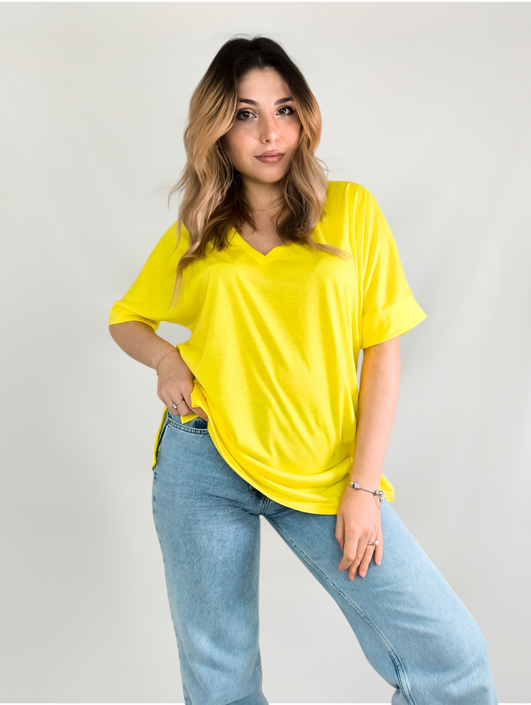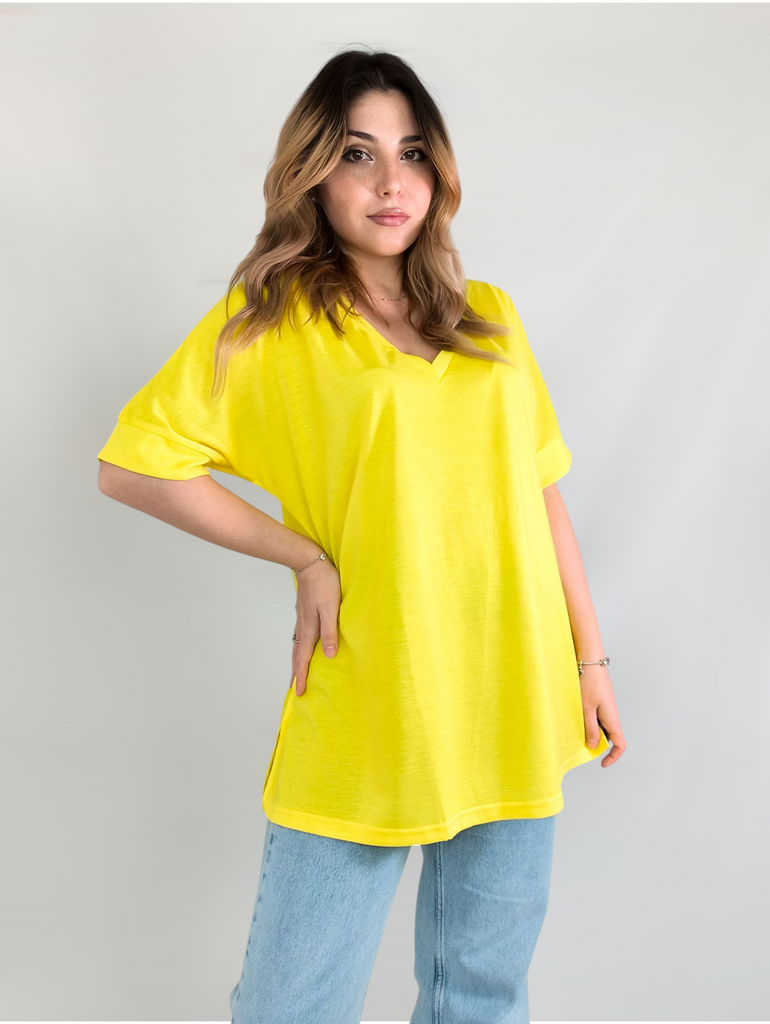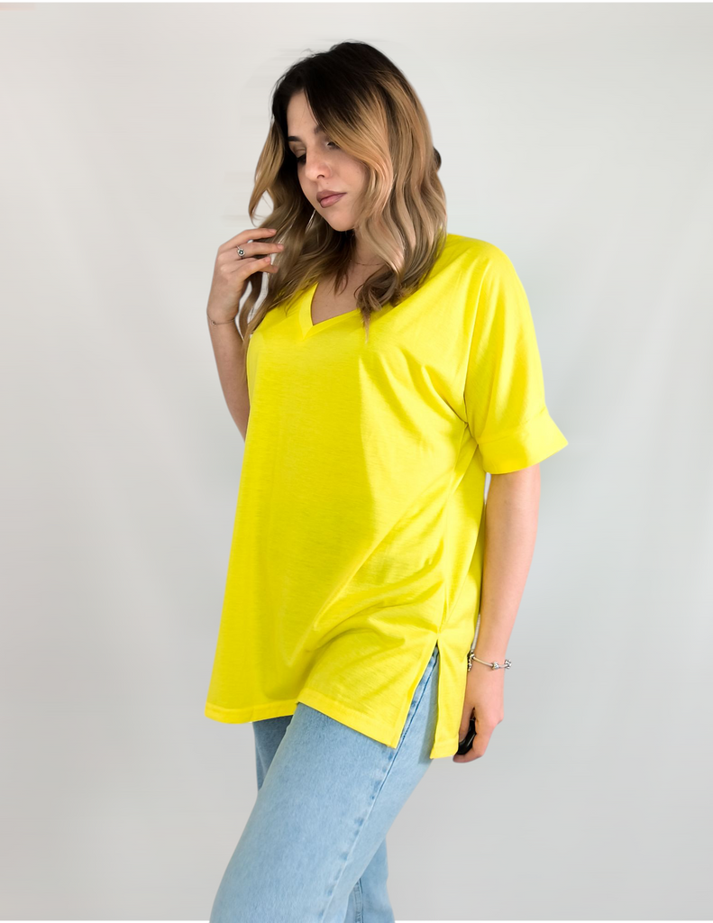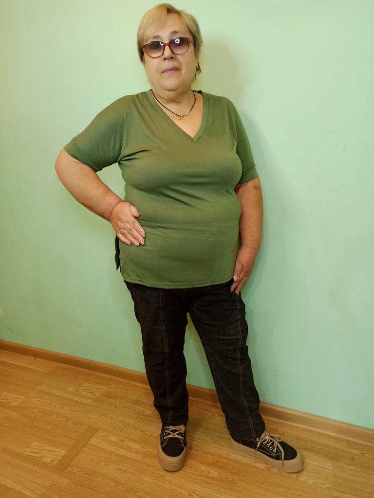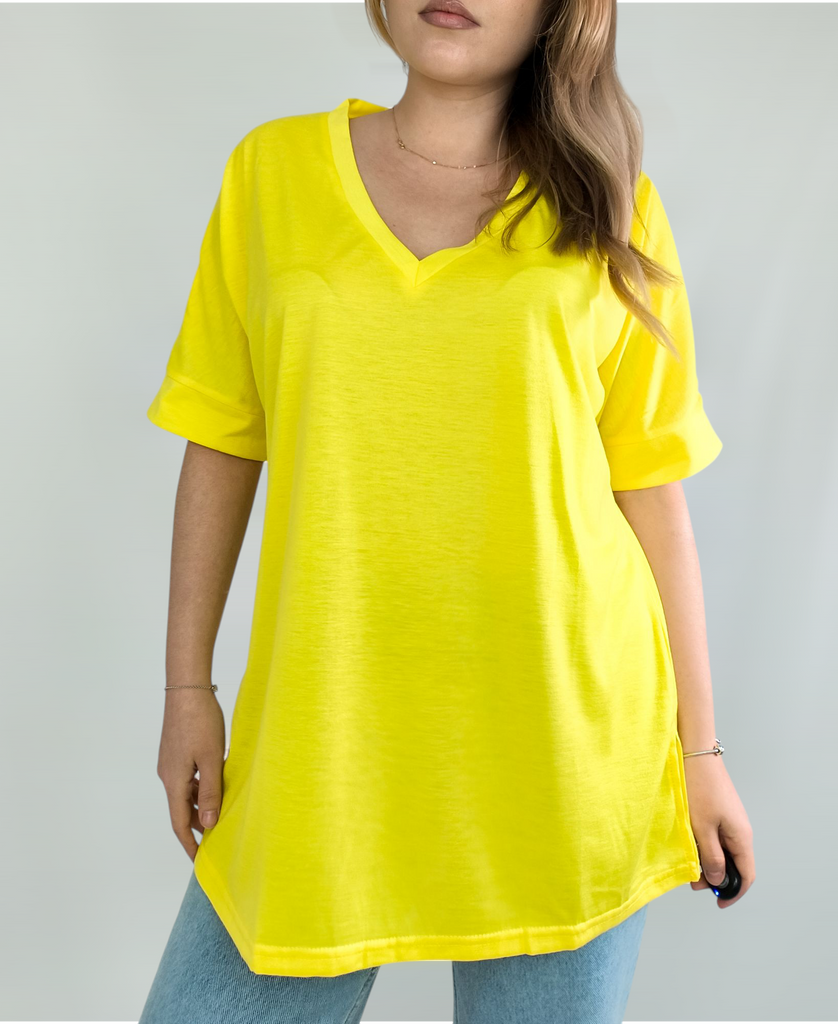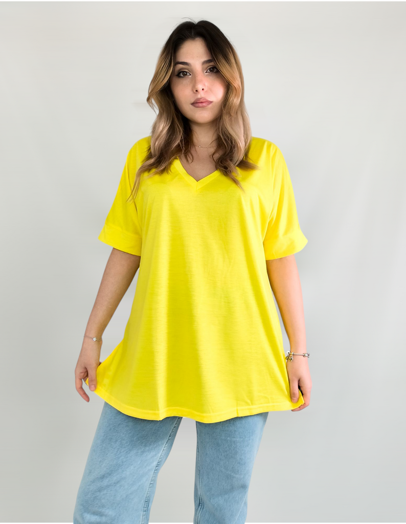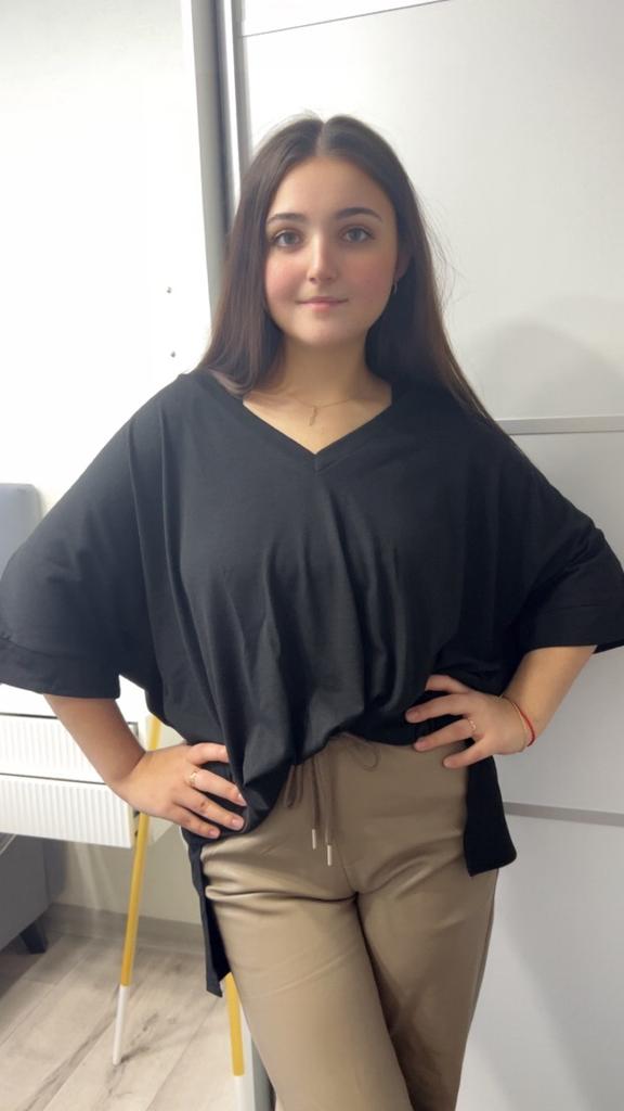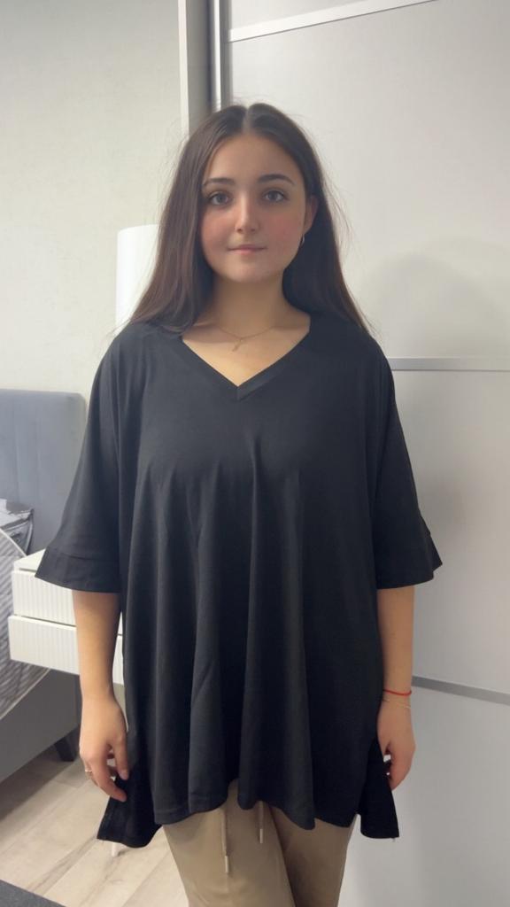 This shirt is a great choice for plus-size women looking for a basic, comfortable, and flattering item for summer. The loose fit combined with a V-neck creates a body-flattering look, with a sense of airiness and comfort.. The uniform and clean colors allow for easy integration with any item of clothing – jeans, a skirt, or shorts. The fabric, made of cotton and spandex, ensures a soft feel on the skin with a slight stretch that adapts to the body's natural movement.. The stereoscopic elements add a subtle design interest, without being too dominant. This shirt is suitable for everyday wear, for work, or for a light summer outing – a classic item that is always worth having in the closet.