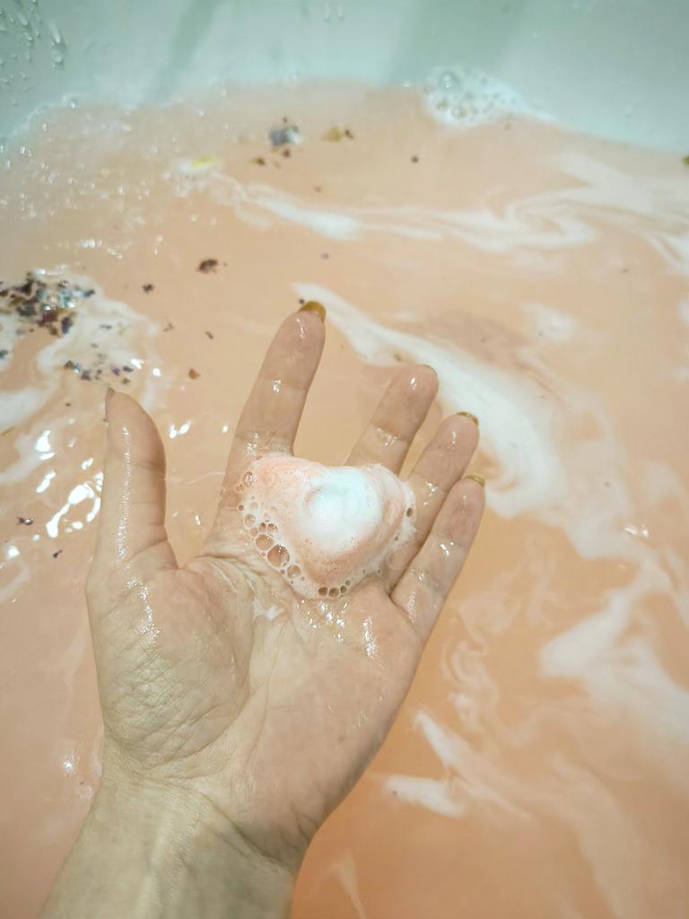 2. Take out a bath salt ball and put it into the water. It will immediately begin to dissolve and release bubbles, aroma, and color. Wait for a few minutes until the bath salt balls are completely dissolved to ensure that the care ingredients are incorporated into the water.