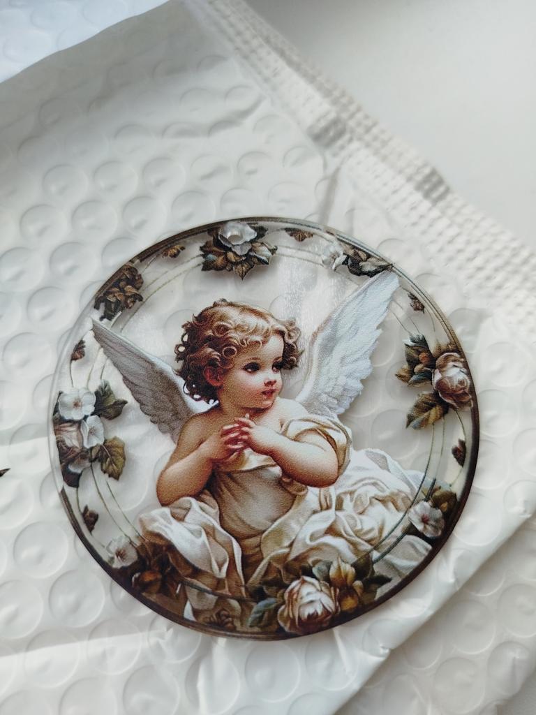 Sweet Angel. beautiful drawing. Bought for a bag. . You need to remove the protective film from the back side - it will be the front, glossy side. . I recommend.