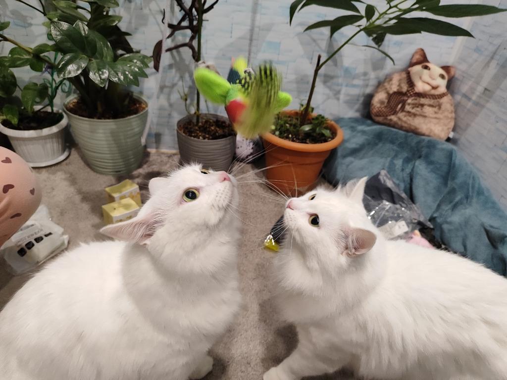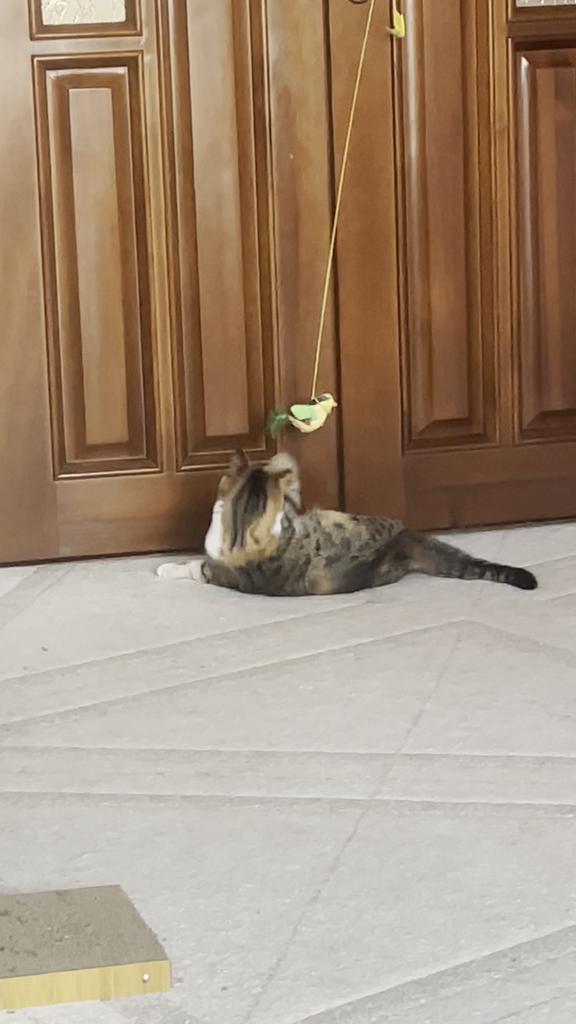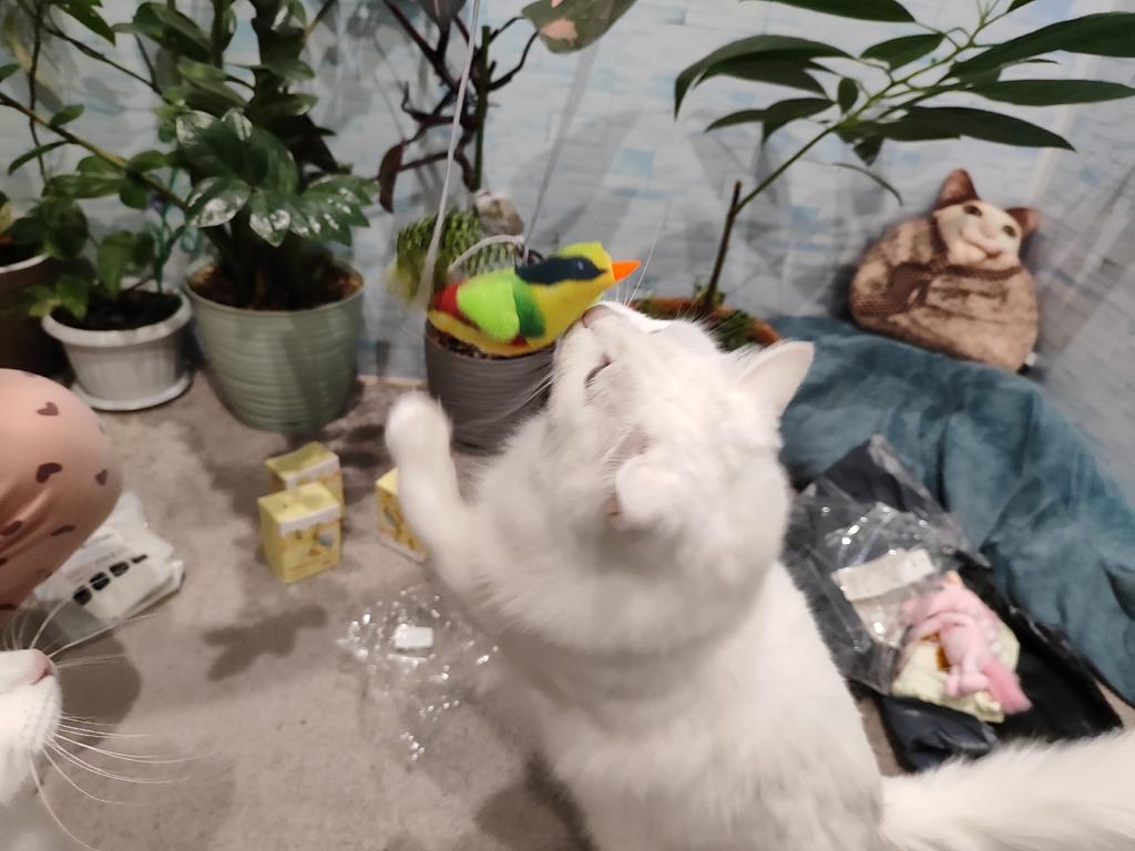 The cats are thrilled – they're showing interest and hunting for the bird! It also makes such a funny little squeal, attracting their attention; they probably think it's alive. They're not interested in other toys anymore; they've already chewed this one up. Luckily, they didn't eat the feathers, though they tried.