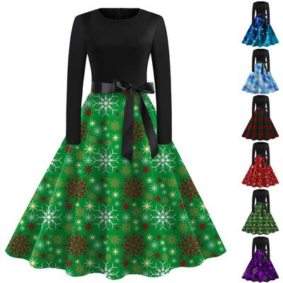Women's Vintage Classic Dress Neck Waist Bow Tie Long Sleeves Christmas Printed Round Neck Swing Dress