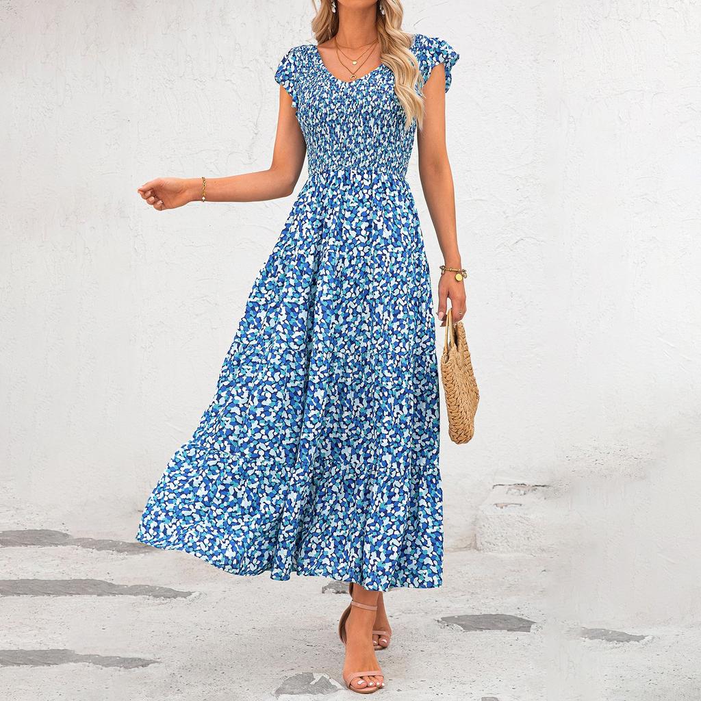 V-neck Backless Pleated Fly Sleeve Printed Dress