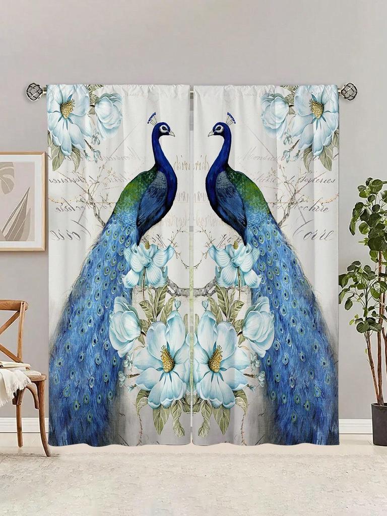 2pcs Vintage Blue Golden Peacock Animal Print Window Curtains,Refer To Bedroom Office Kitchen Living Room Study Home Decor