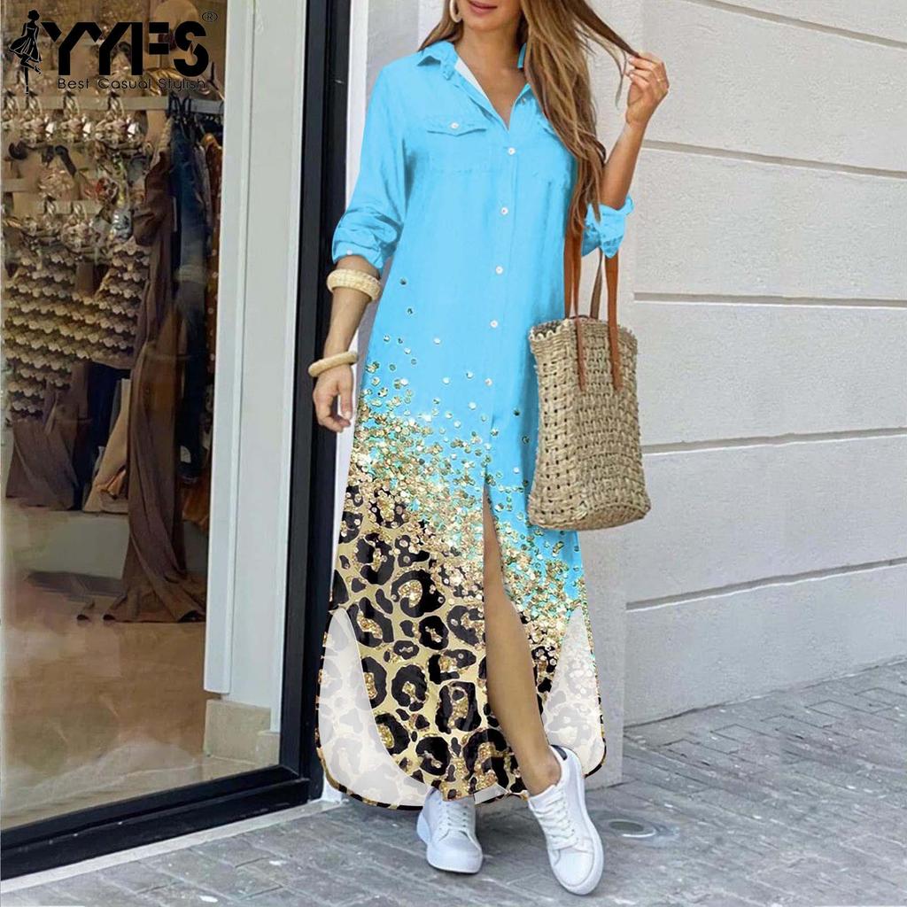YYFS Women's Fashion Spring Fall Leopard Print Long Sleeve POLO Neck Loose Waistline Casual Dresses