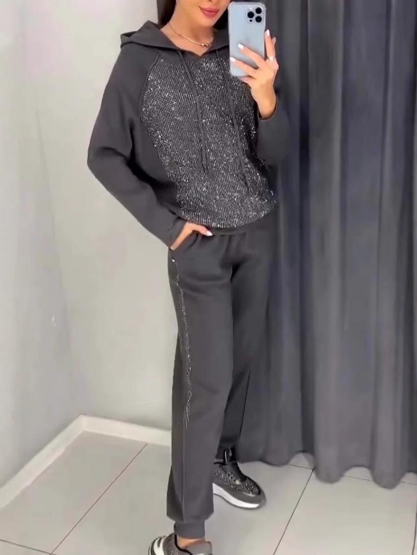 Women's Sets Plus Size Solid Color Long Sleeves with Pockets Rhinestone Hooded Sweatshirt Trousers 2 Piece Set