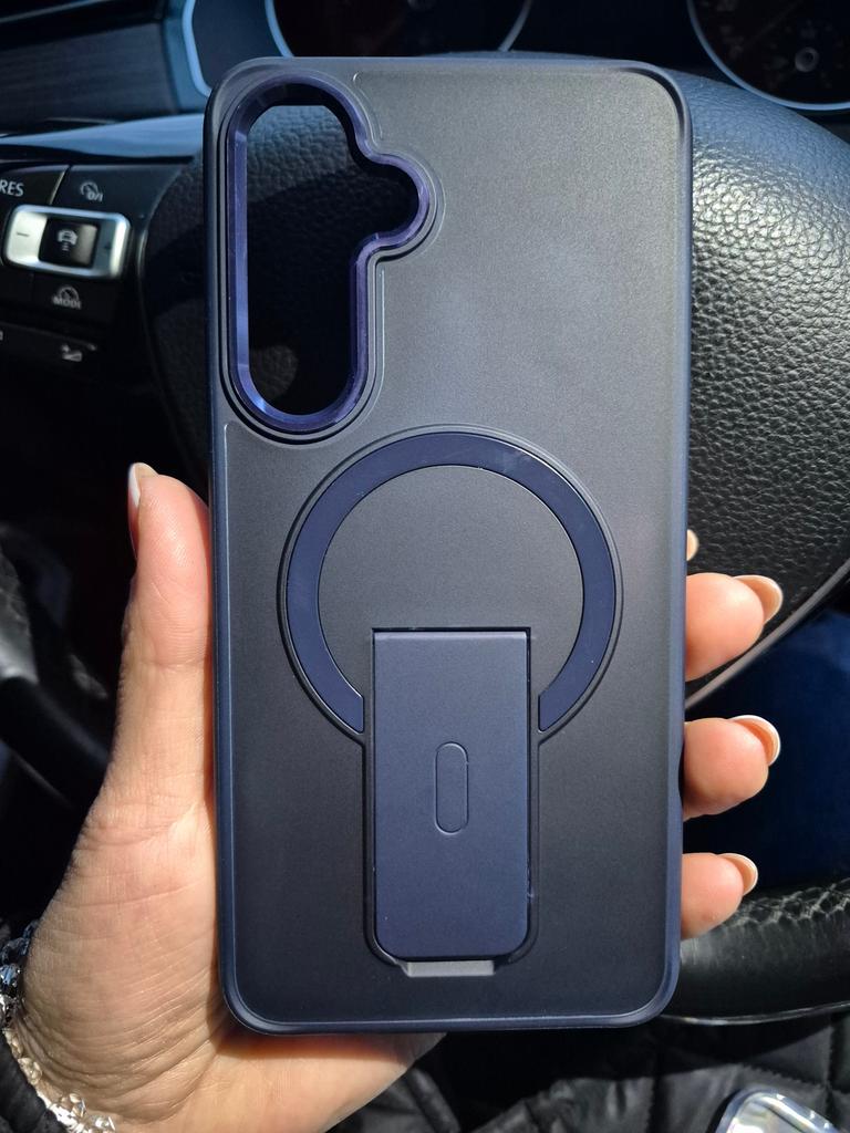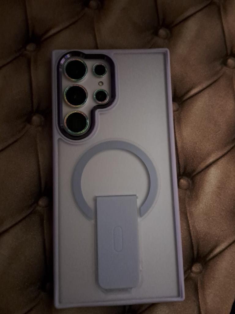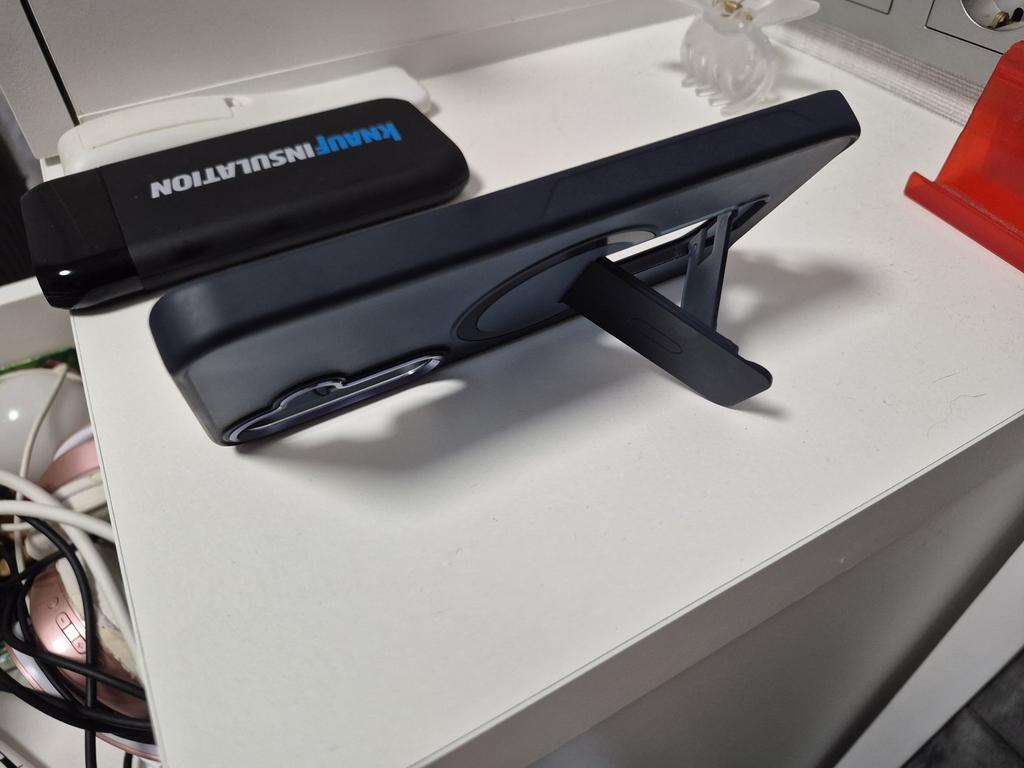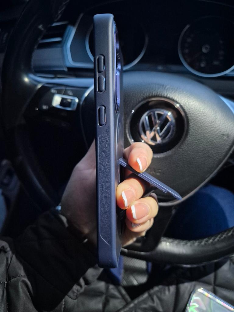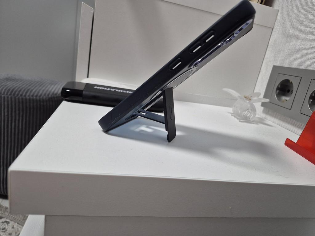 This is a mega cool case! Looks expensive! Super comfortable. That stand folds away and doesn't get in the way in your pocket. All edges are raised and the cameras are reliably protected. The color is darker than I expected. On a black phone it's almost black