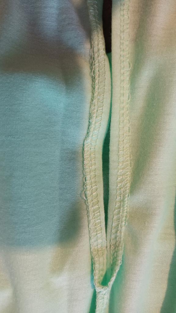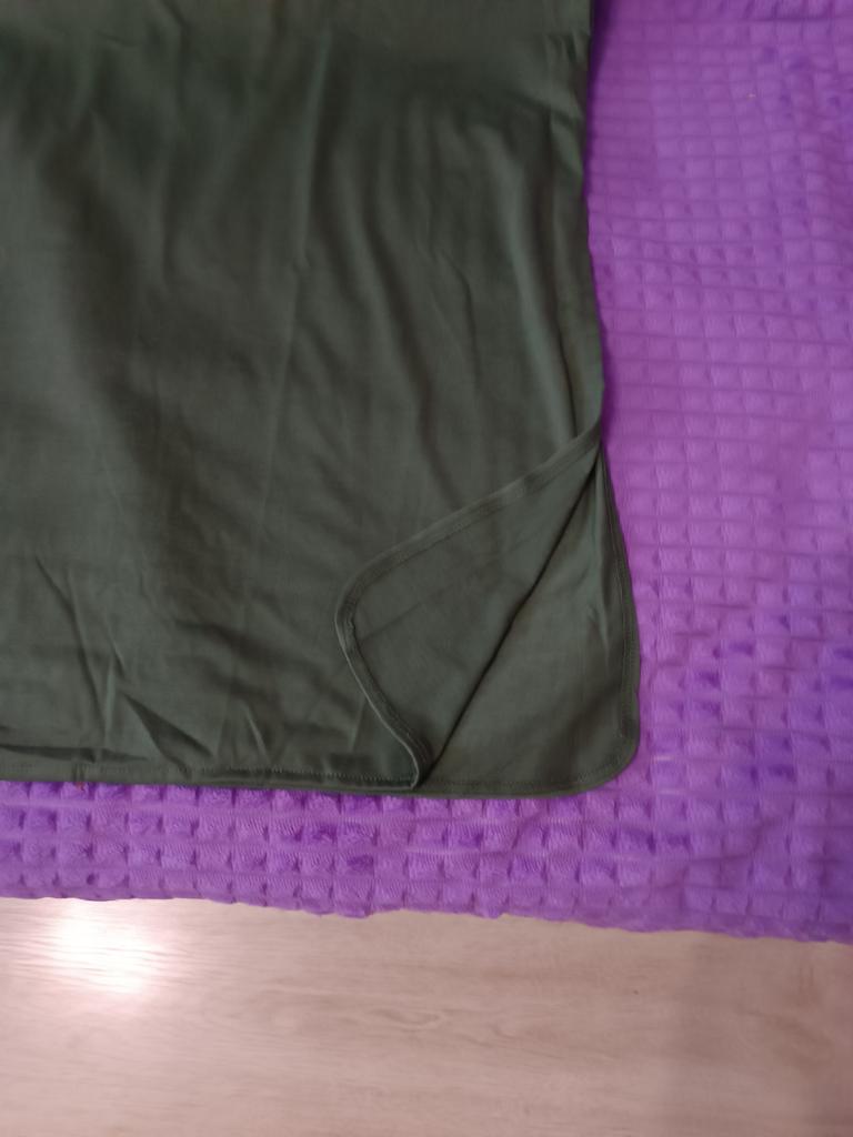 Runs small, material is like a t-shirt, sewn like a nightgown, threads are sticking out