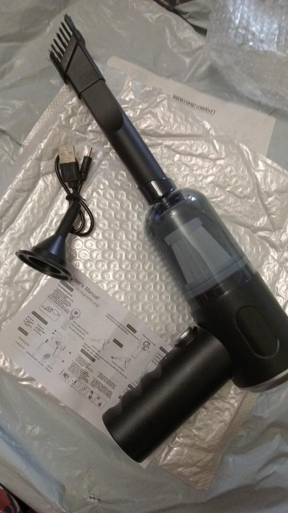 So small, but vacuums the car very well, easy to assemble, charges like a phone