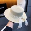 Women's Summer Straw Hat with Ribbon, Wide Brim Sun Protection Beach Cap, Elegant Flat Top Fisherman Hat for Outdoor Use