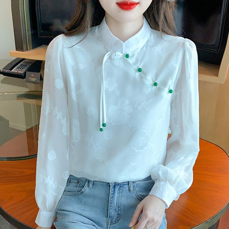 2025 Spring New Chinese Style Women Blouses Shirts Long Sleeve Stand Collar Black White Chiffon Blouse Shirt Women Tops J771