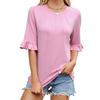 Women's Spring and Summer New Solid Colour Striped Round Neck Ruffled Sleeve Mid-sleeve T-shirt Tops