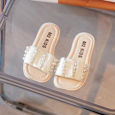 Girls Beige Rhinestone Chain Fashion Children Flat Sandals Open Toe Cute PU Versatile 2024 Summer New Casual Kids Slippers Cute