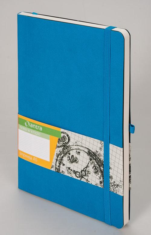 Introducing the Impresja A5 Dot Notebook in an elegant blue color, perfect for those who value sophistication and functionality in their stationery. Published by Antra in 2018, this notebook features a robust integrated cover that ensures durability for on-the-go use. Measuring at a convenient 14.5x20.5cm, it fits effortlessly into your bag, making it an ideal companion for meetings, lectures, or travel notes.