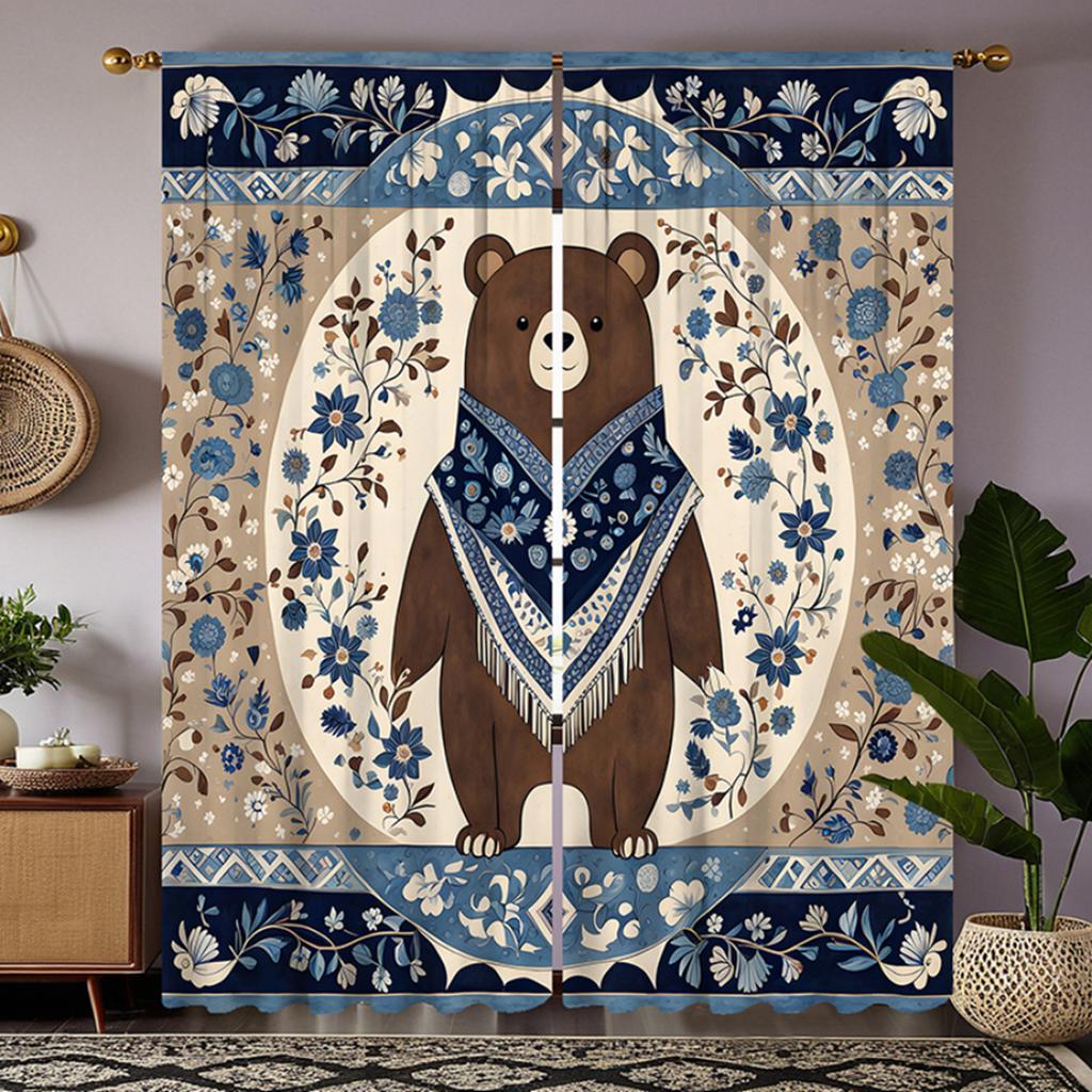 2pcs HD National Wind Floral Bear Decorative Curtain Blue Digital Printed Curtain Home Decoration Style Decoration Living Roo