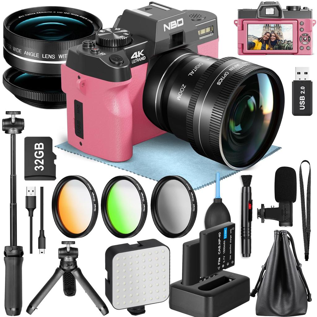 This digital camera offers the latest 4K video recording and 48MP high-resolution photography, and is equipped with a 3-inch touch screen that rotates 180 degrees, and a removable 52mm wide-angle lens and macro lens. Easily connect to your computer via USB connection for file transfer, video chat, and real-time streaming. Upload photos and videos smoothly via WiFi. It also features remote control and real-time preview via smartphone app. Contains two 1500mAh high-capacity lithium-ion and 32GB high-speed microSD card to support long-time shooting. With a variety of shooting modes and white balance settings, it can be used in any scene. Warning: This product comes with a. Please handle it properly. Improper use may lead to injury.