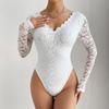 Elevate your style with this sexy solid color lace long-sleeved bodysuit. Crafted from comfortable and durable polyester material, this slim-fitting piece features a lace design that accentuates your figure for a fashionable and sexy look.