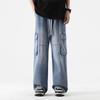 These men's jeans are designed with a Japanese retro aesthetic, featuring a loose, straight, wide-leg fit for a comfortable, casual look. They are crafted from high-quality cotton material, ensuring durability and breathability. The jeans include multiple pockets, making them practical for everyday wear and perfect for those who appreciate a workwear-inspired style.