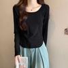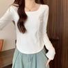 Right Shoulder Fishbone Waist Long-sleeved T-shirt for Women Autumn New Design Square Collar Curved Hem Bottoming Shirt Top Clothes