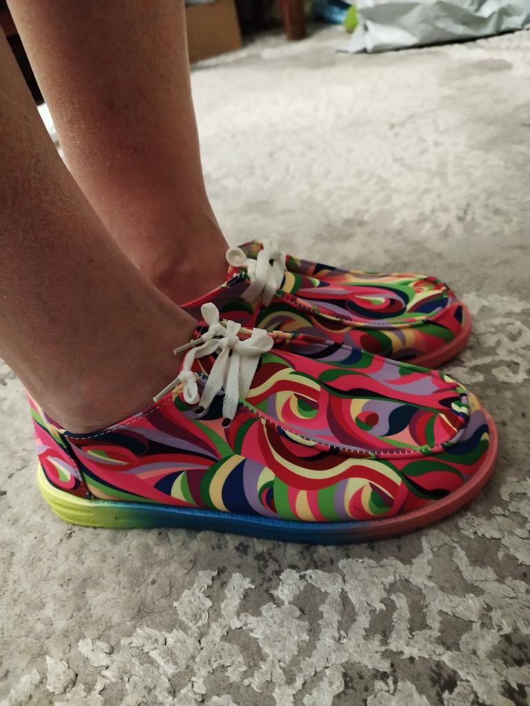 The sneakers are cool, bright, the size corresponds to our size. I ordered size 37. They are the same as in the pictures, comfortable, lightweight, there is a slight smell. I recommend them, very satisfied.